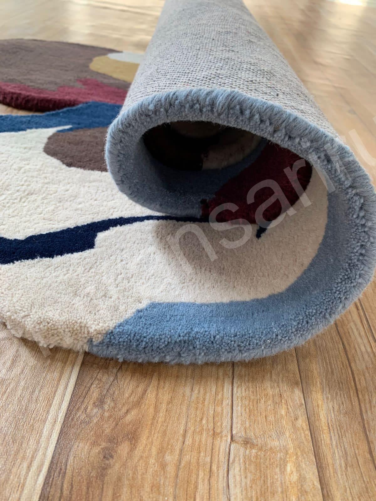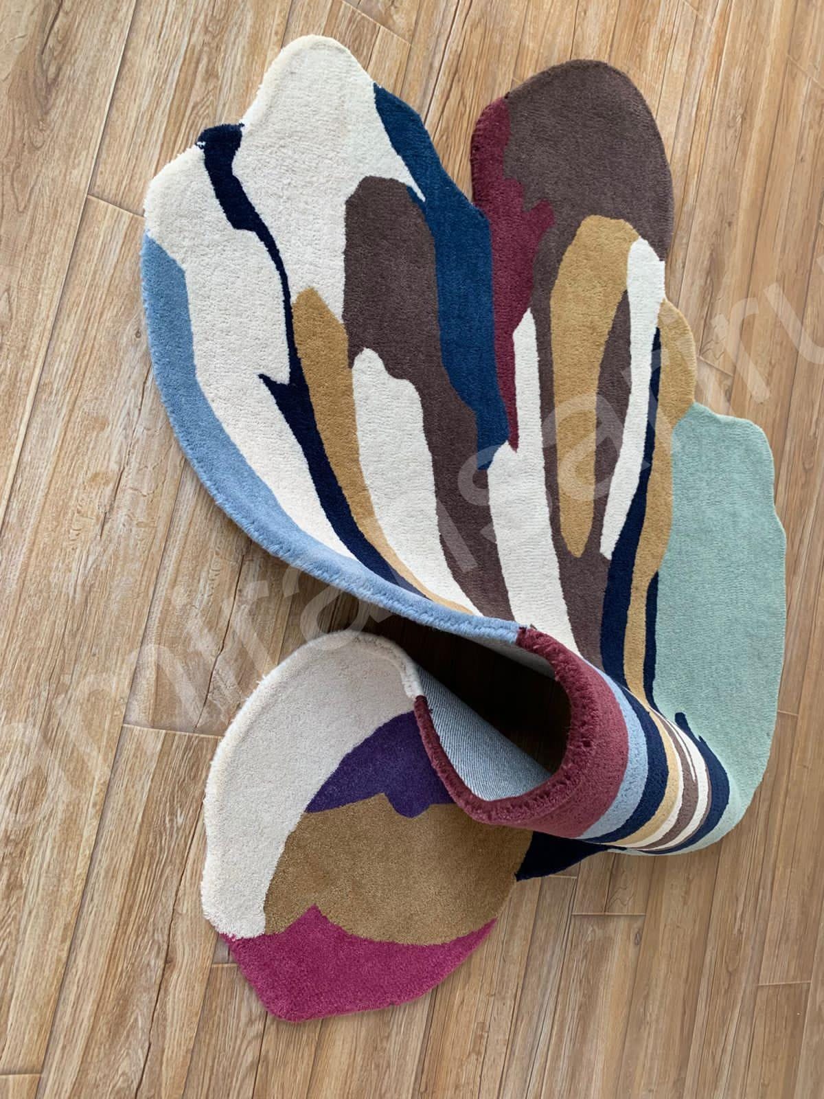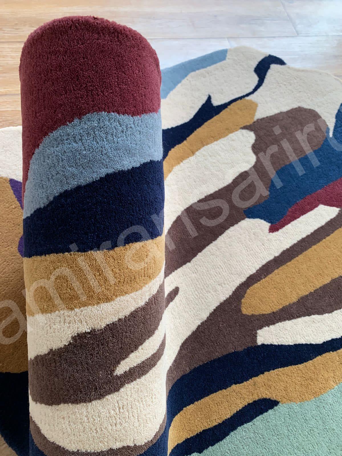 Add a bold artistic touch to your home with this Hand-Tufted Wool Rug featuring a striking abstract organic shape and a rich multicolor palette. Crafted to resemble a flowing, painterly composition, this rug blends hues of mustard yellow, deep navy, sky blue, burgundy, cream, purple, and teal to create a captivating visual centerpiece.