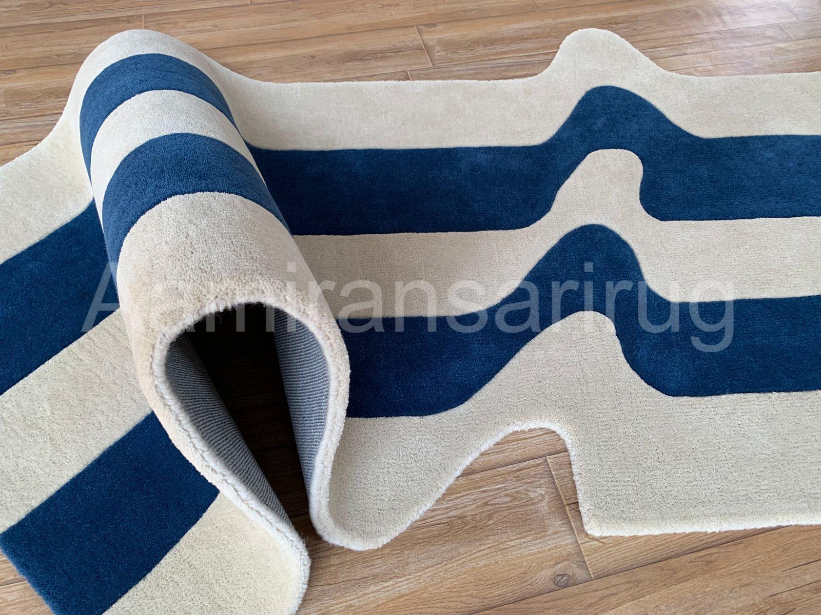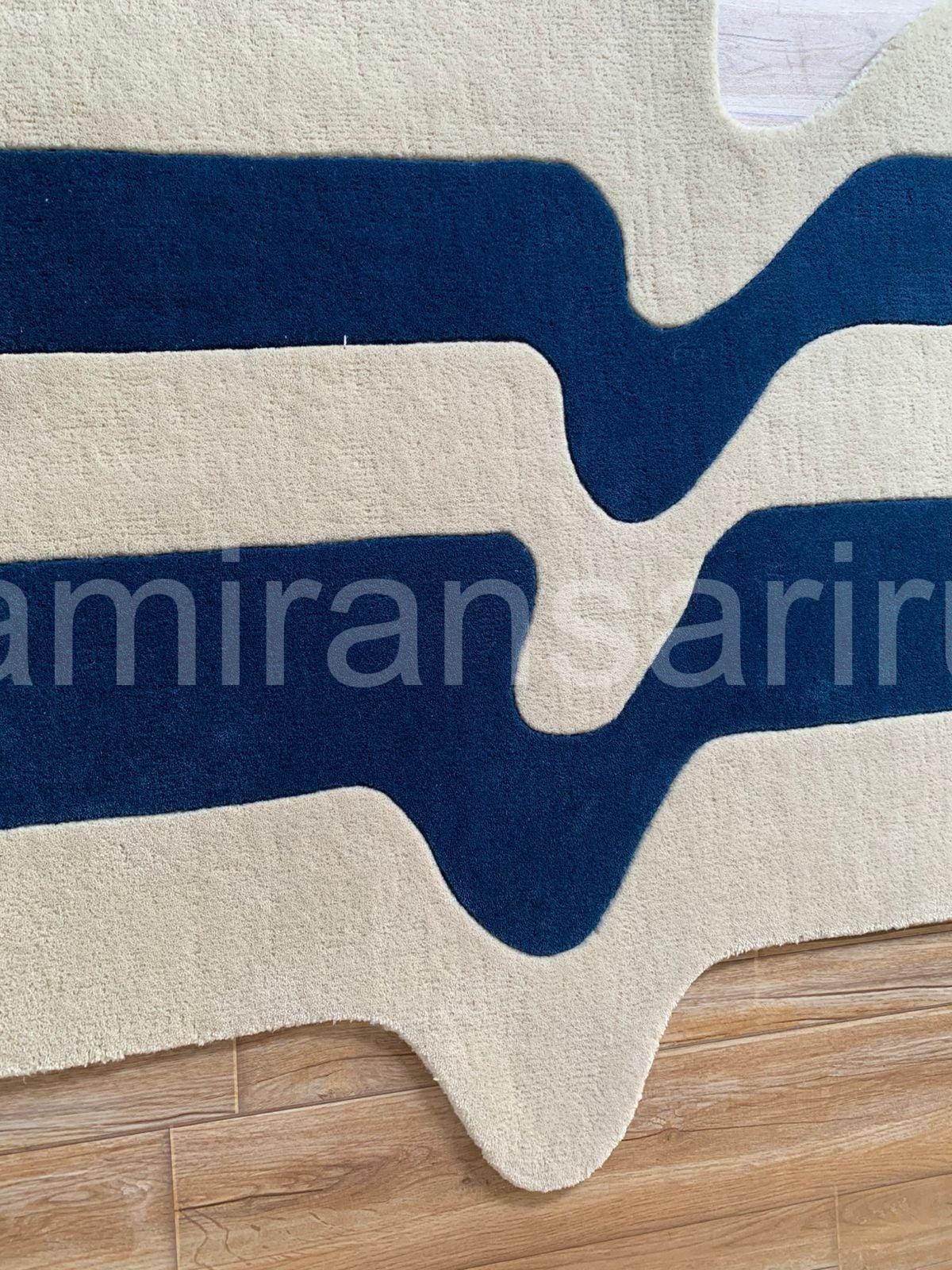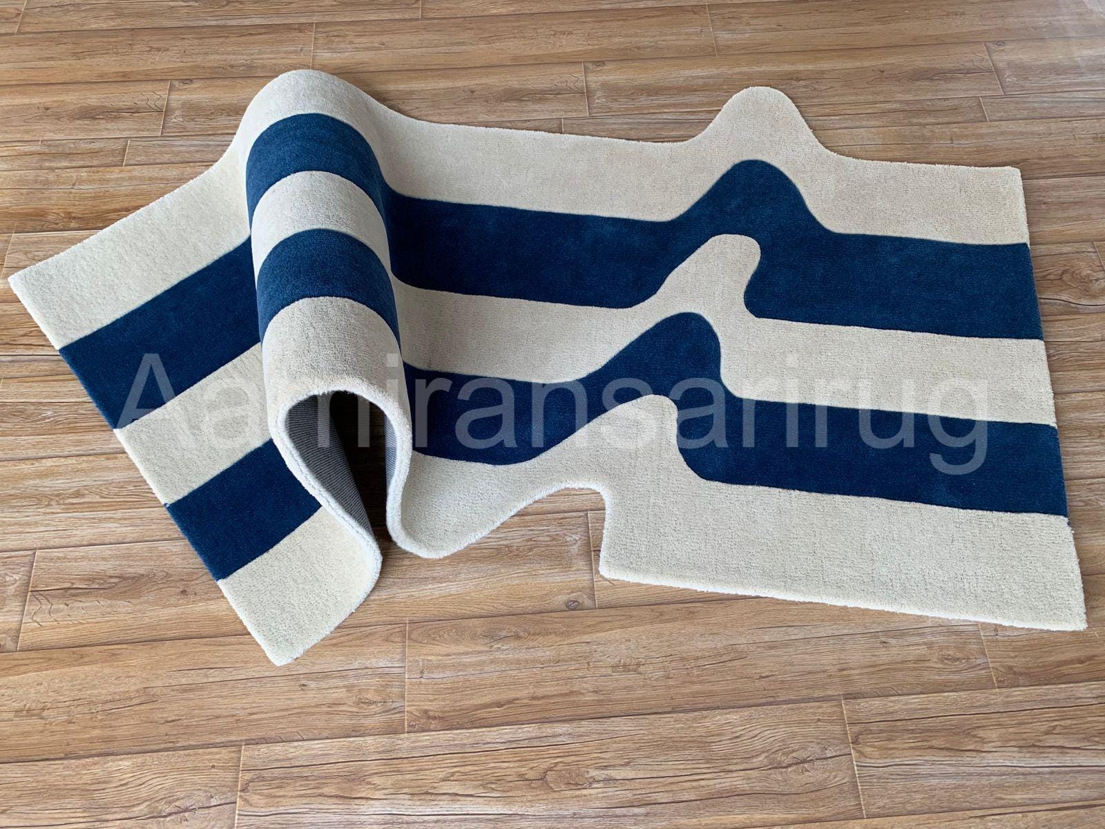 Introduce modern sophistication to your home with this Hand-Tufted Wool Rug, designed in a bold abstract geometric style. Featuring deep navy blue stripes flowing seamlessly across a soft white background, this rug creates a striking contrast that blends minimalism with artistic flair. Its irregular outline adds a sculptural quality, making it more than just a floor covering—it’s a contemporary design statement.