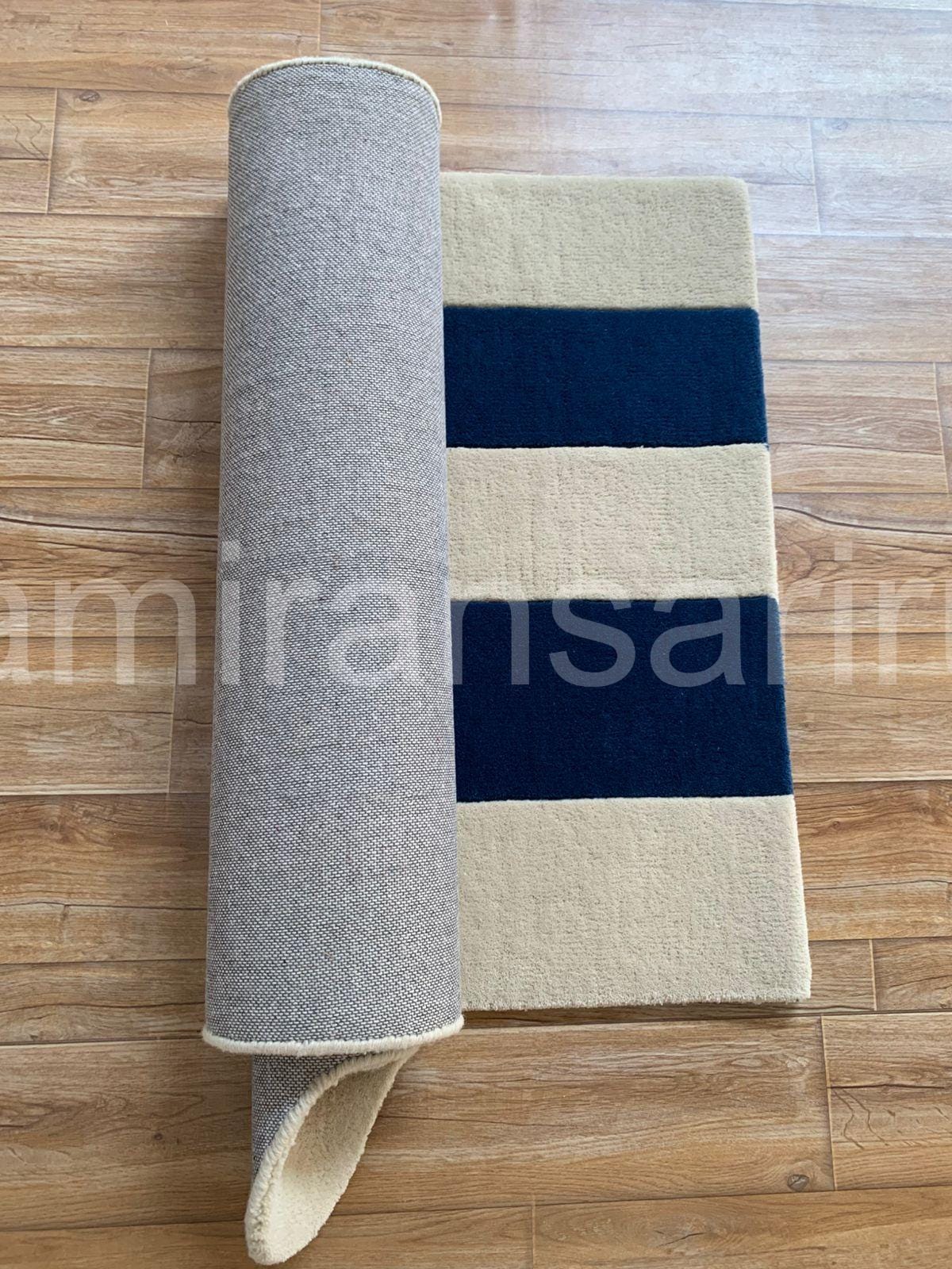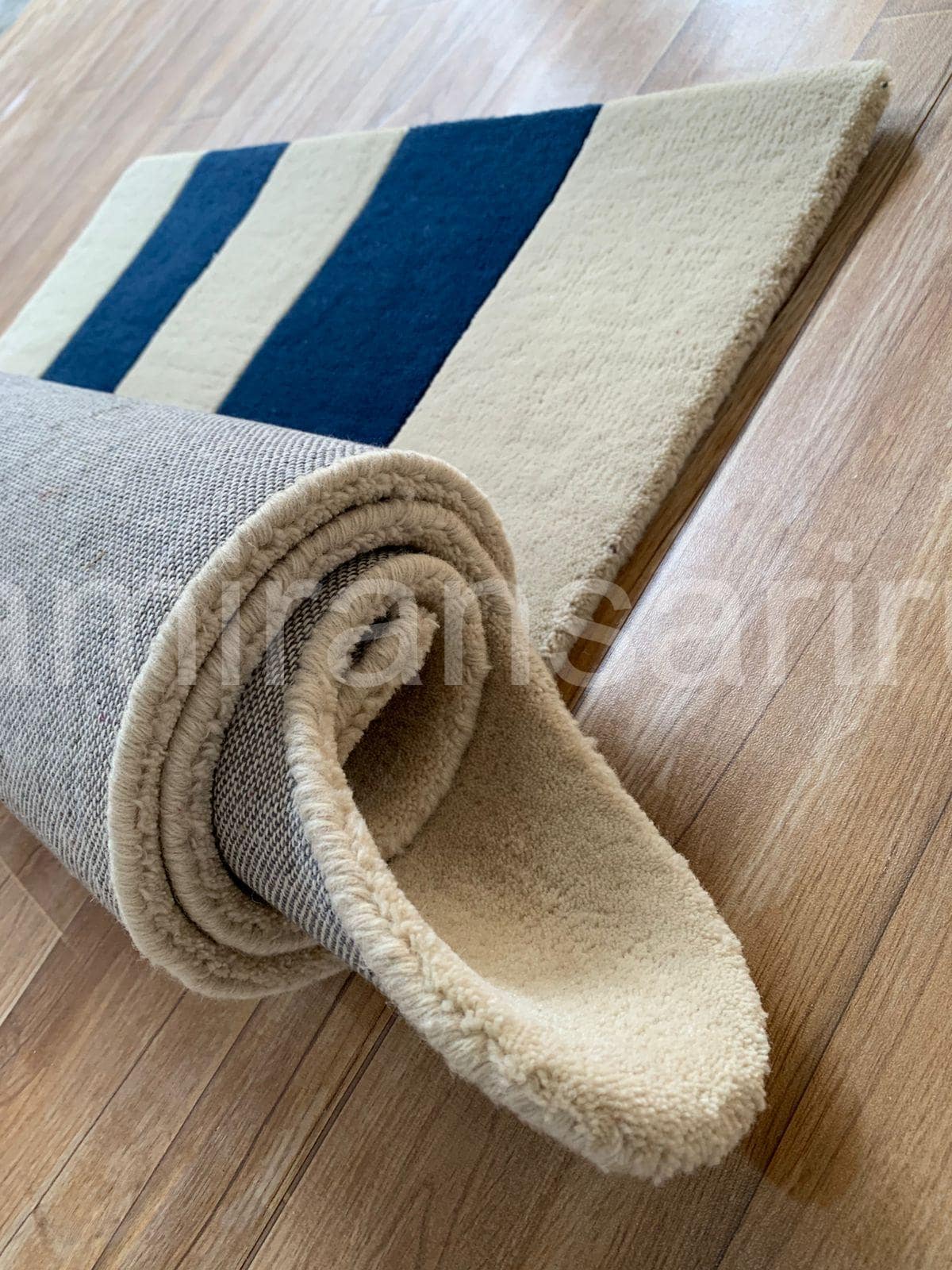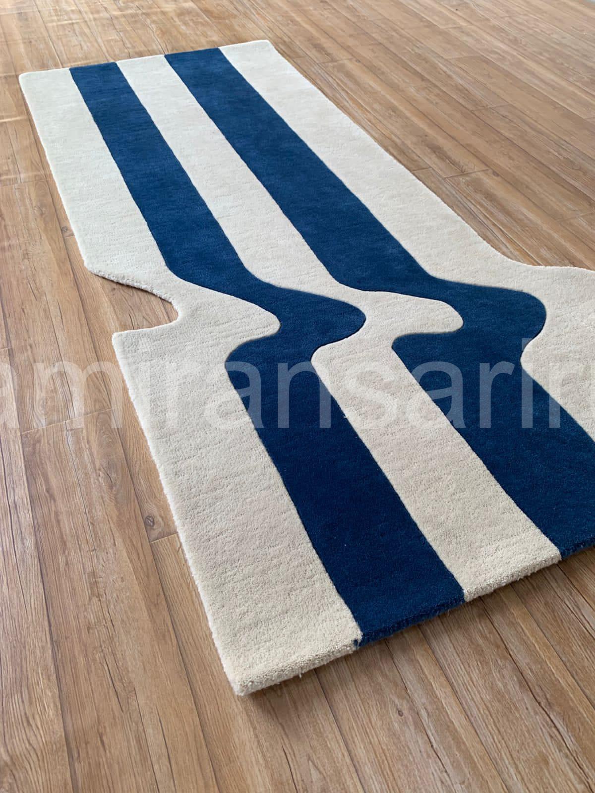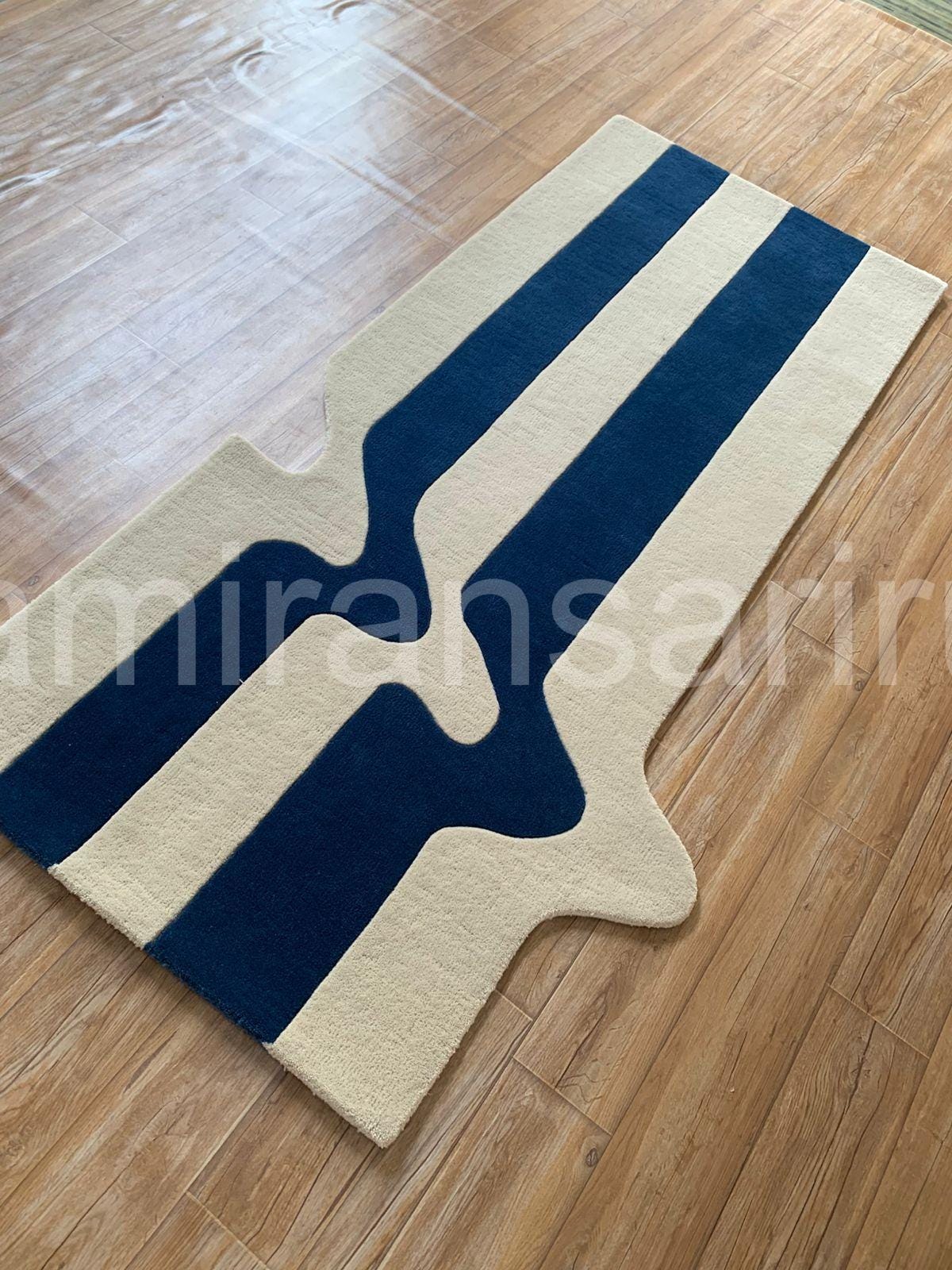 Introduce modern sophistication to your home with this Hand-Tufted Wool Rug, designed in a bold abstract geometric style. Featuring deep navy blue stripes flowing seamlessly across a soft white background, this rug creates a striking contrast that blends minimalism with artistic flair. Its irregular outline adds a sculptural quality, making it more than just a floor covering—it’s a contemporary design statement.
