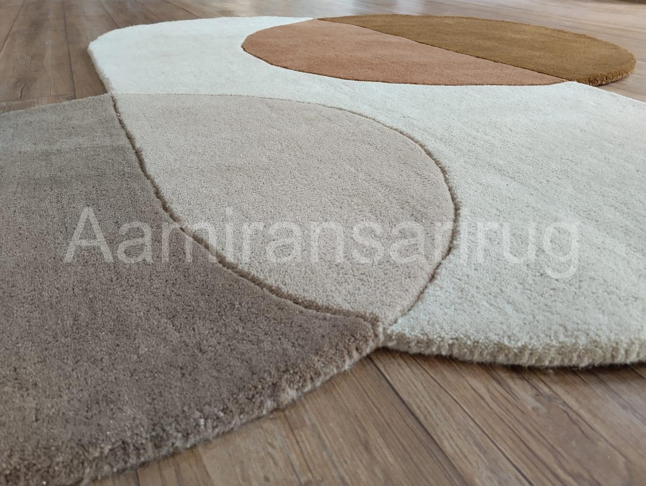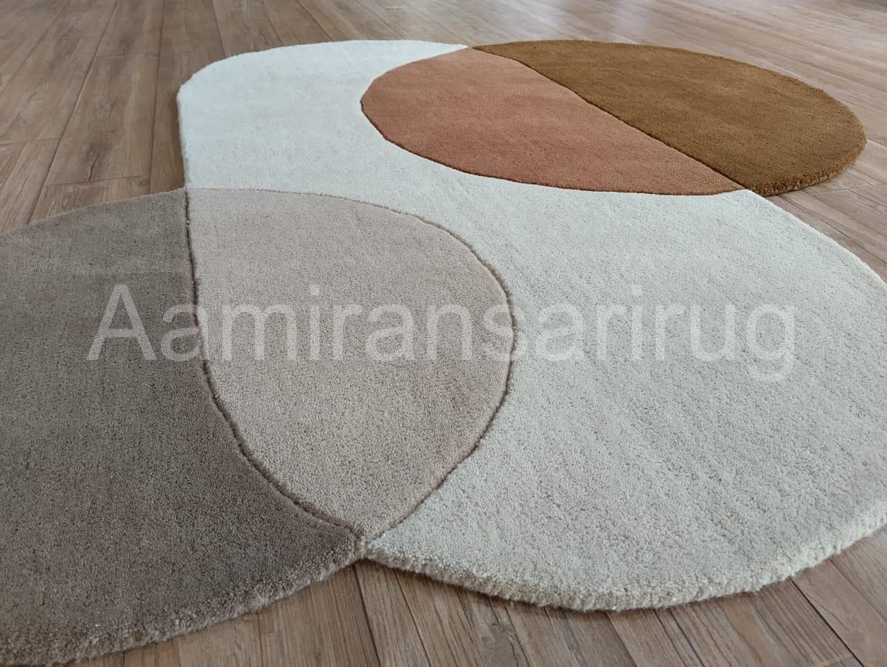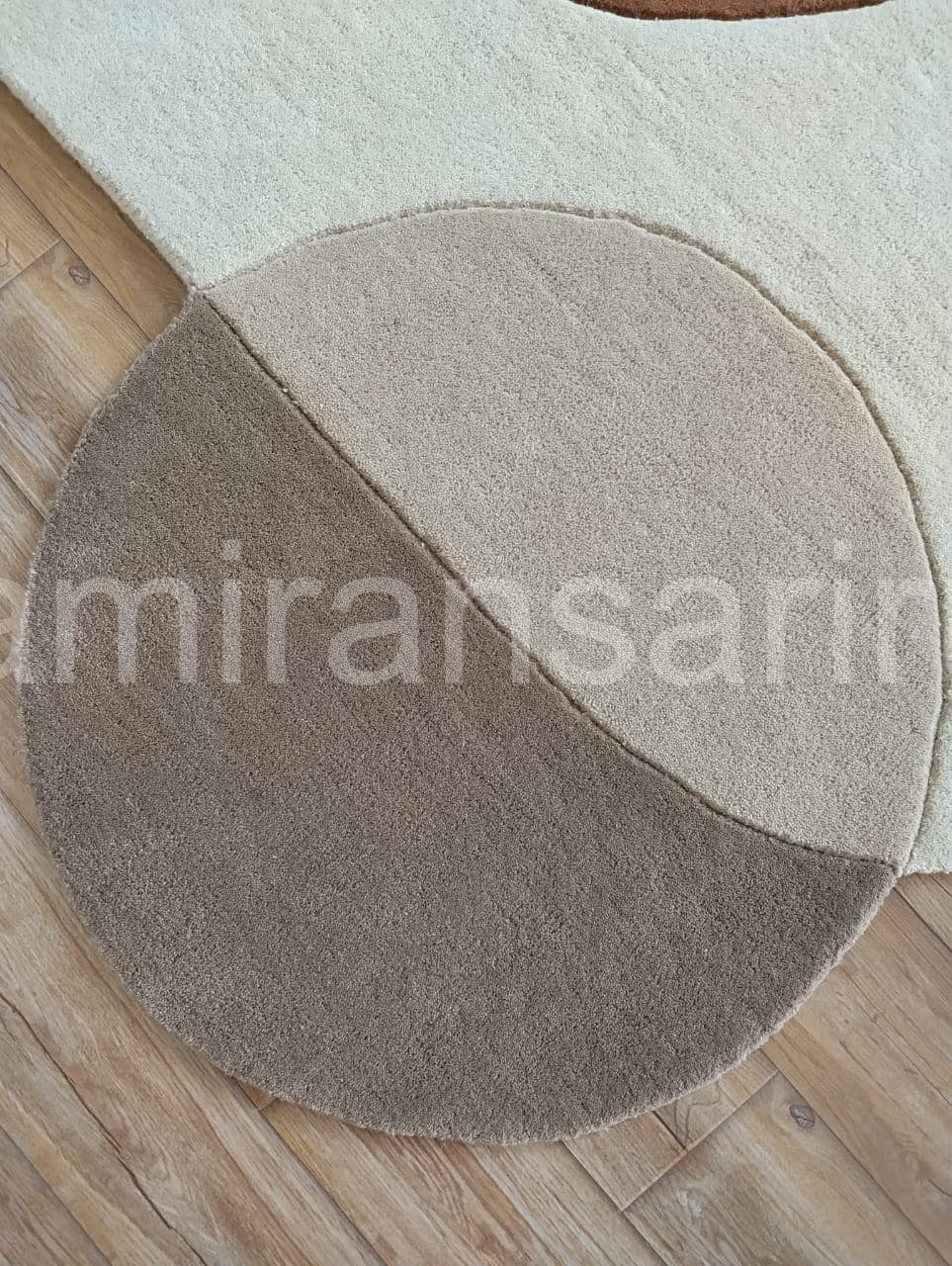 5x5 ready to ship Hand-Tufted Wool Rug Add a touch of modern artistry to your interiors with this Hand-Tufted Wool Rug, designed in a unique geometric circle pattern with warm neutral tones. Featuring overlapping round shapes in earthy shades of brown, beige, cream, and terracotta, this rug brings a harmonious balance of contemporary design and timeless elegance.