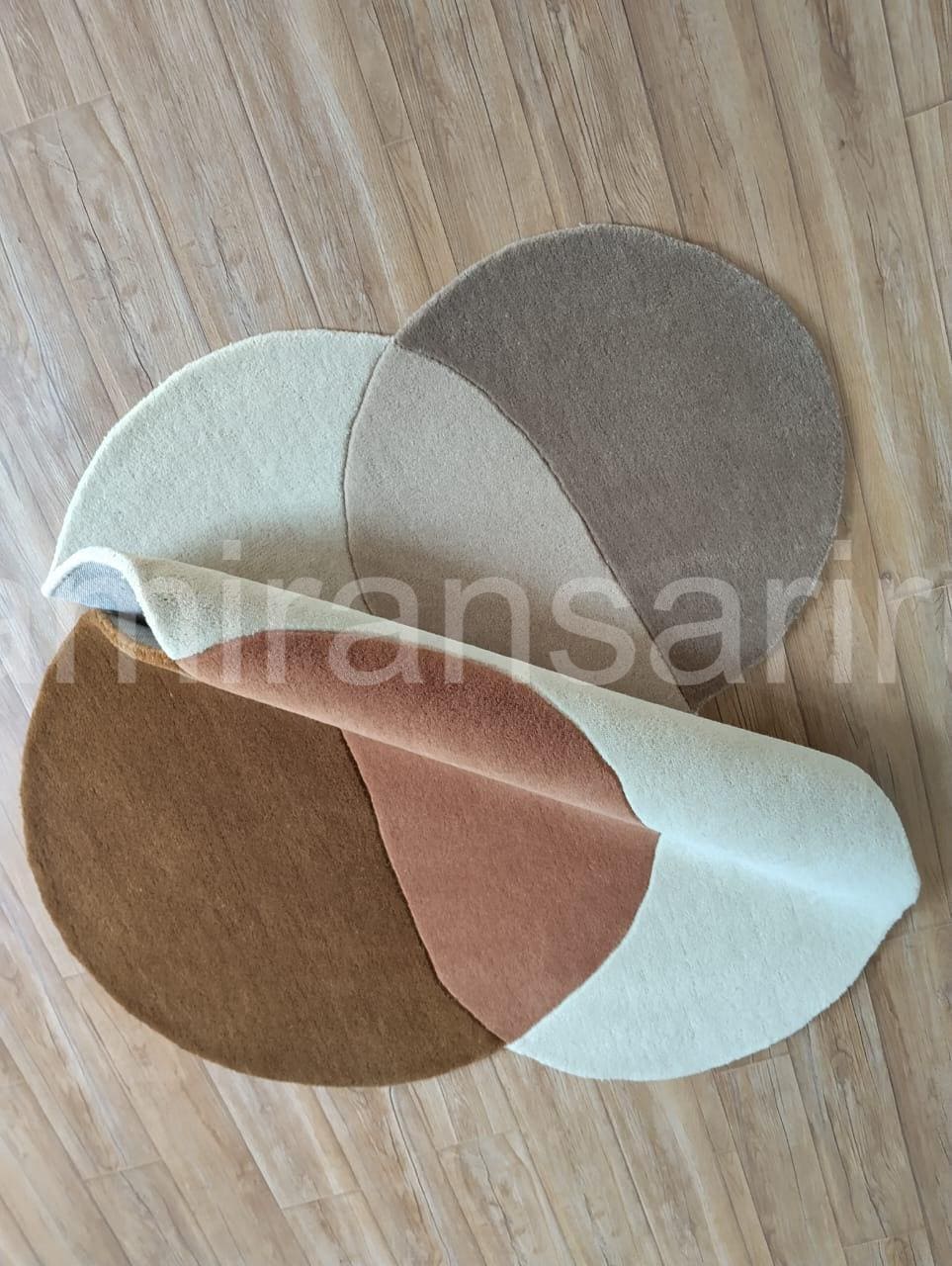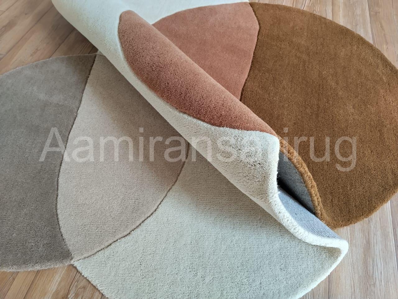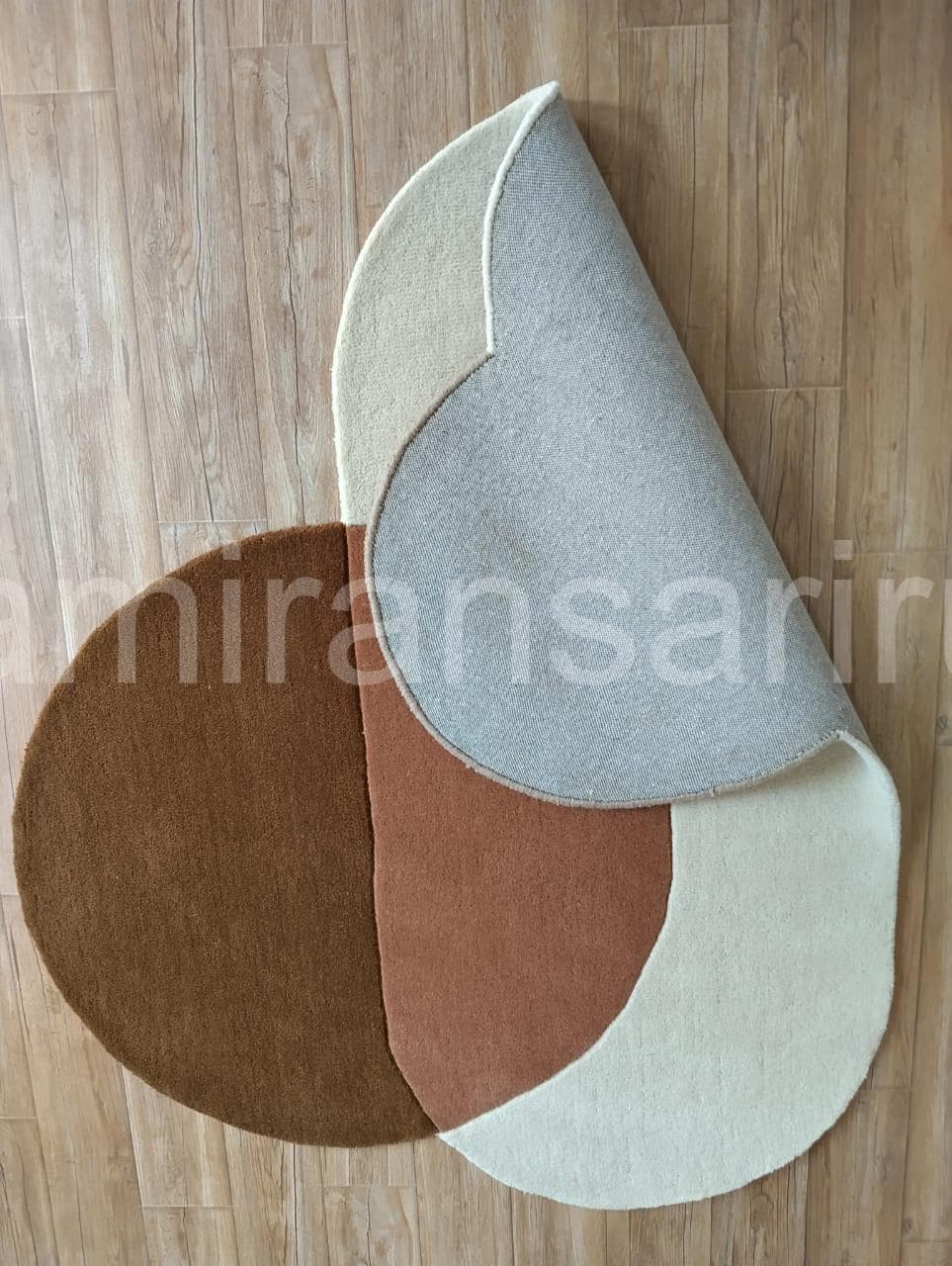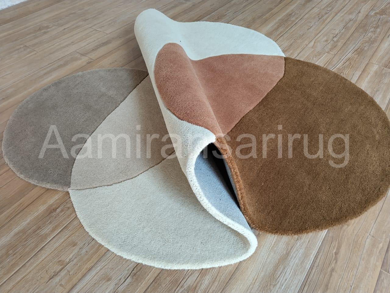 5x5 ready to ship Hand-Tufted Wool Rug Add a touch of modern artistry to your interiors with this Hand-Tufted Wool Rug, designed in a unique geometric circle pattern with warm neutral tones. Featuring overlapping round shapes in earthy shades of brown, beige, cream, and terracotta, this rug brings a harmonious balance of contemporary design and timeless elegance.