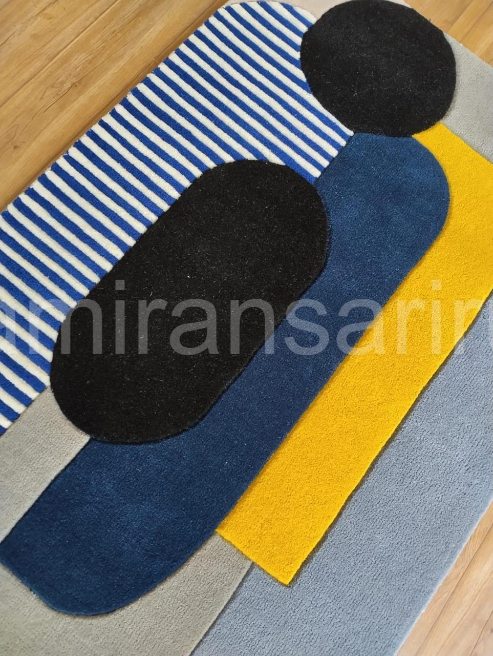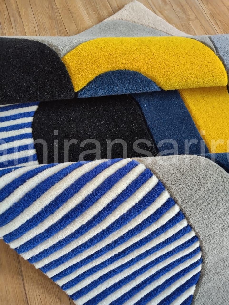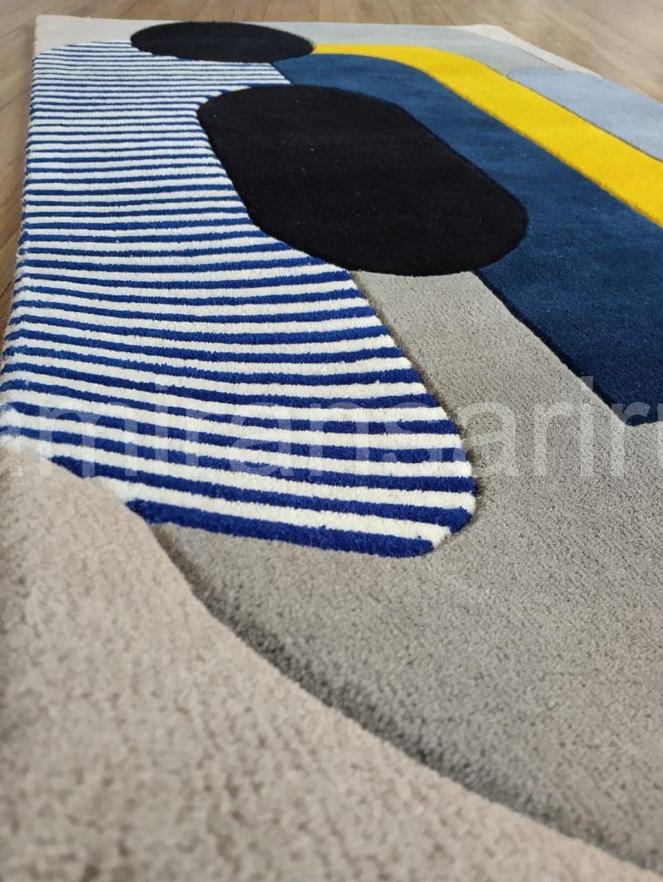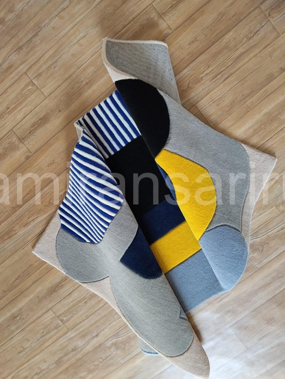 Bring bold style and artistic flair to your home with this Hand-Tufted Wool Rug, featuring a stunning modern abstract geometric design. Showcasing a vibrant mix of colors—navy blue, mustard yellow, grey, black, and cream—this rug is perfect for those who love contemporary interiors with a touch of creativity. The unique combination of stripes, bold blocks, and rounded geometric shapes makes it a statement piece that instantly uplifts any living space.