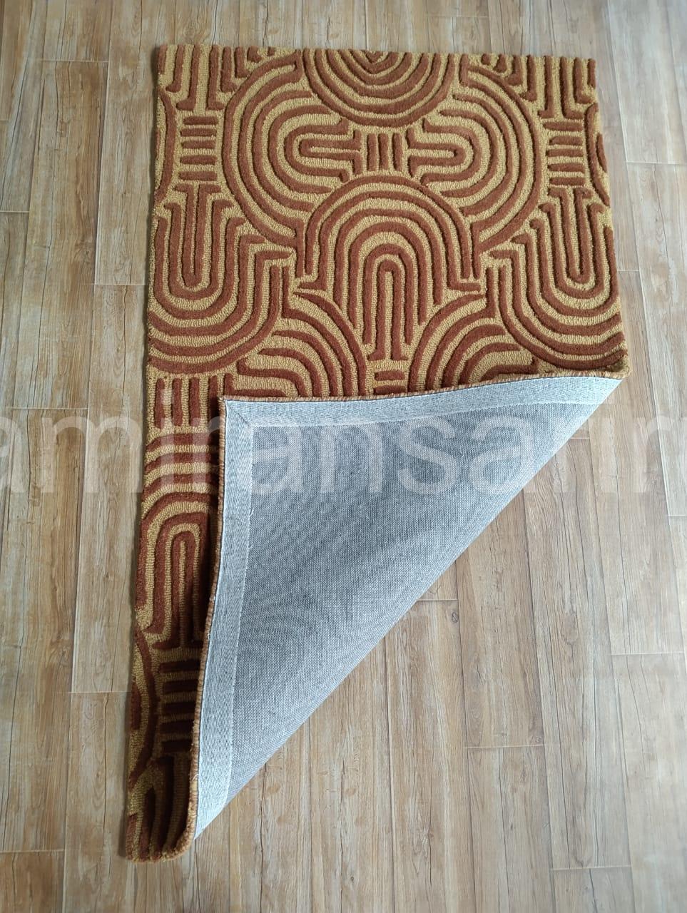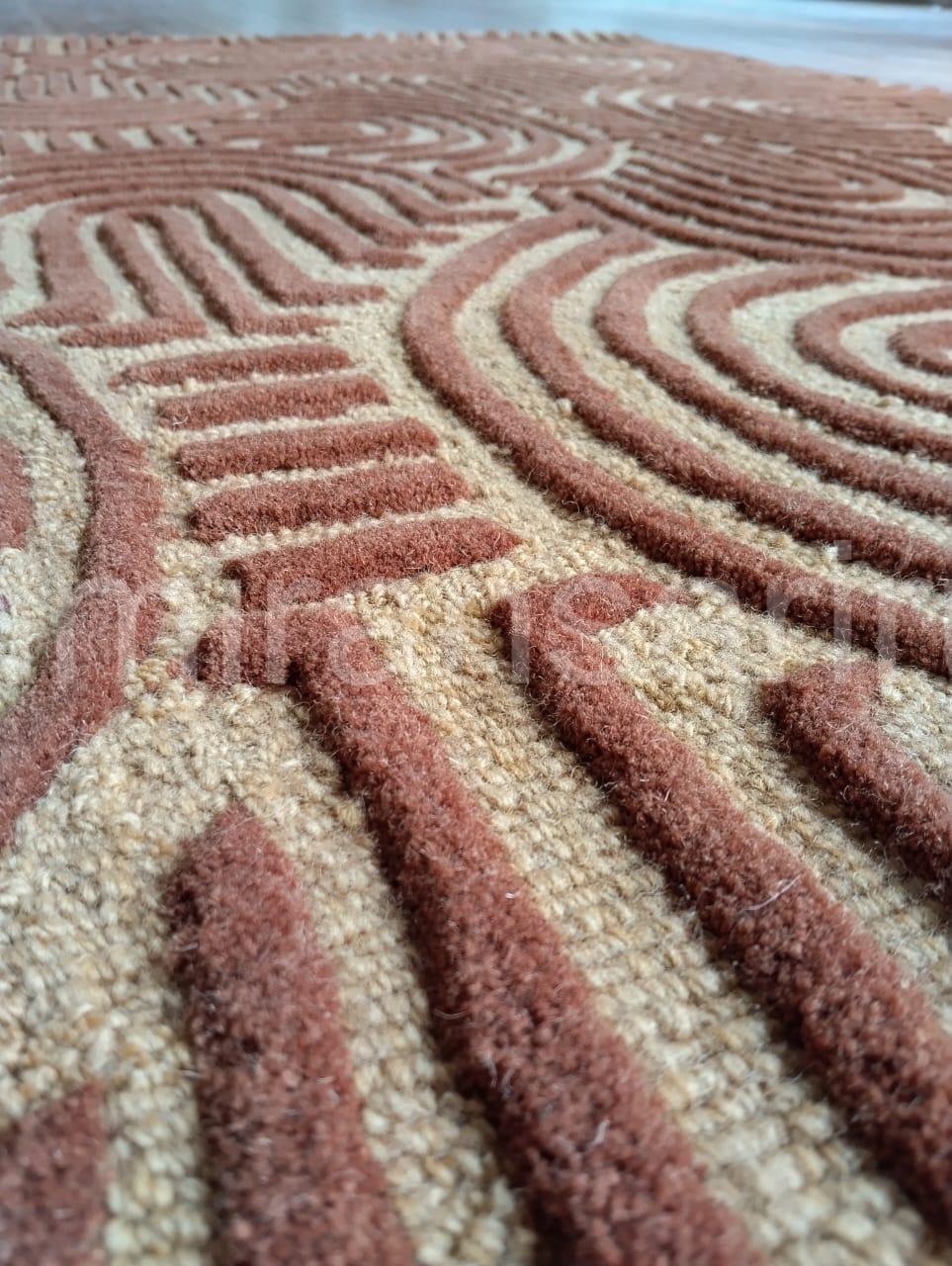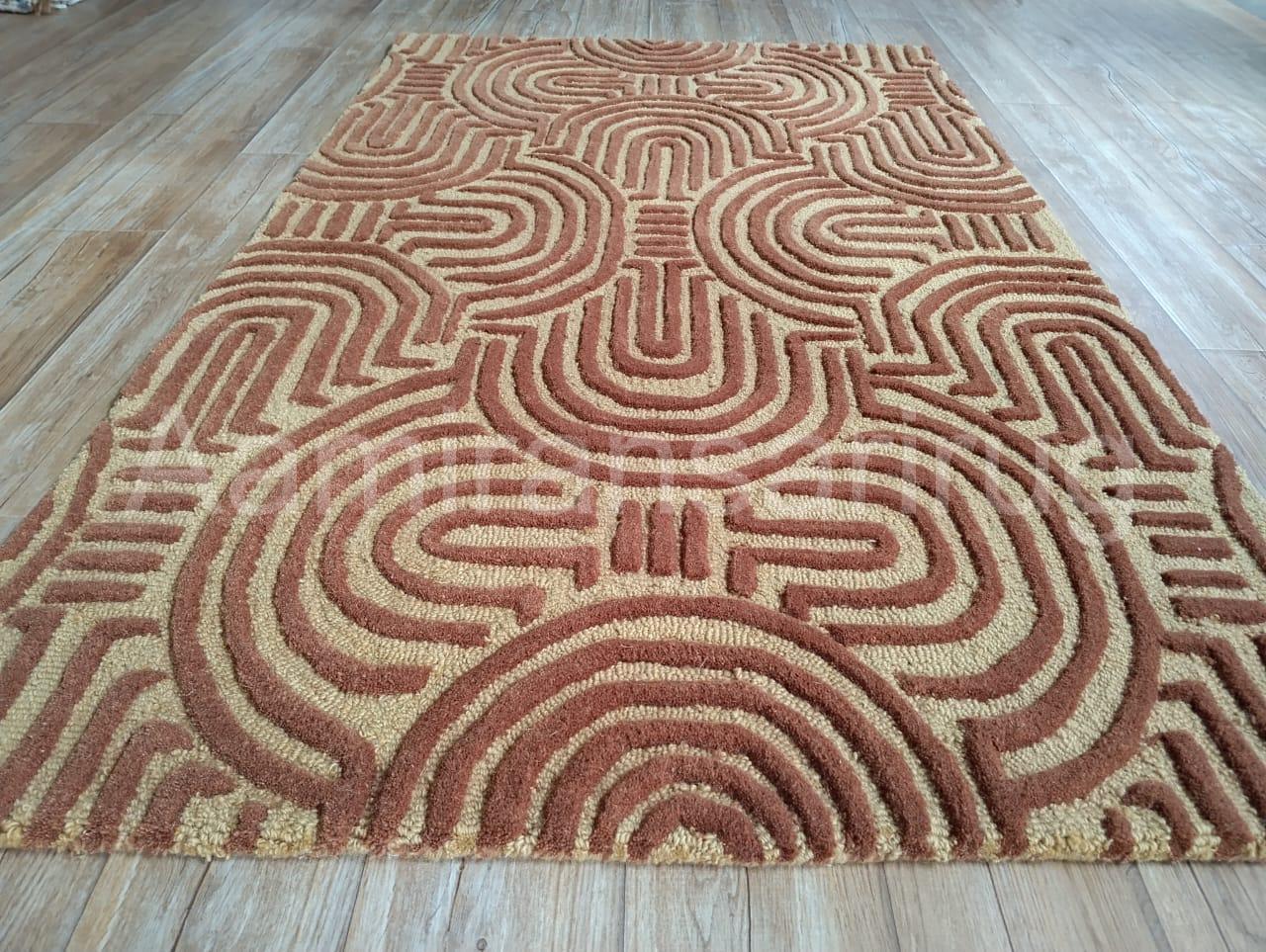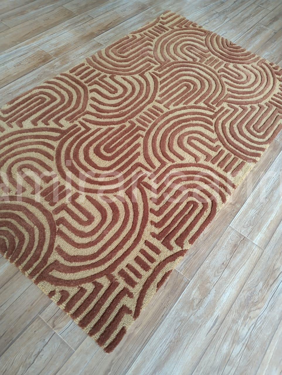 Elevate your home with this stunning hand tufted wool carpet, crafted with care to bring warmth, comfort, and timeless design to your space. This premium area rug features a bold geometric pattern in earthy tones, perfect for adding a touch of modern sophistication to any room. The unique texture highlights intricate arcs and lines, giving your interior a striking mid-century and boho-inspired aesthetic.