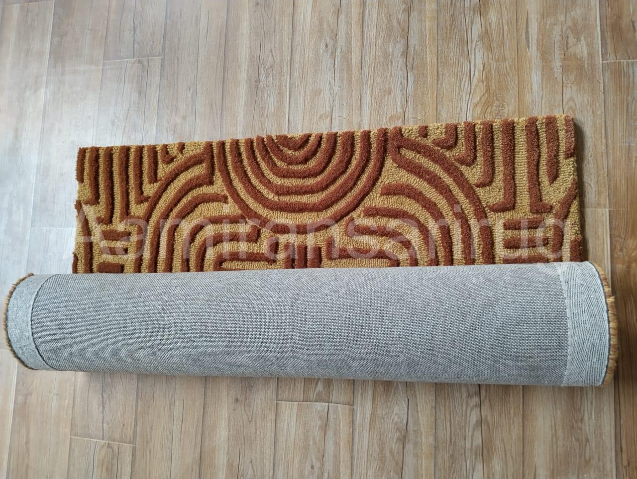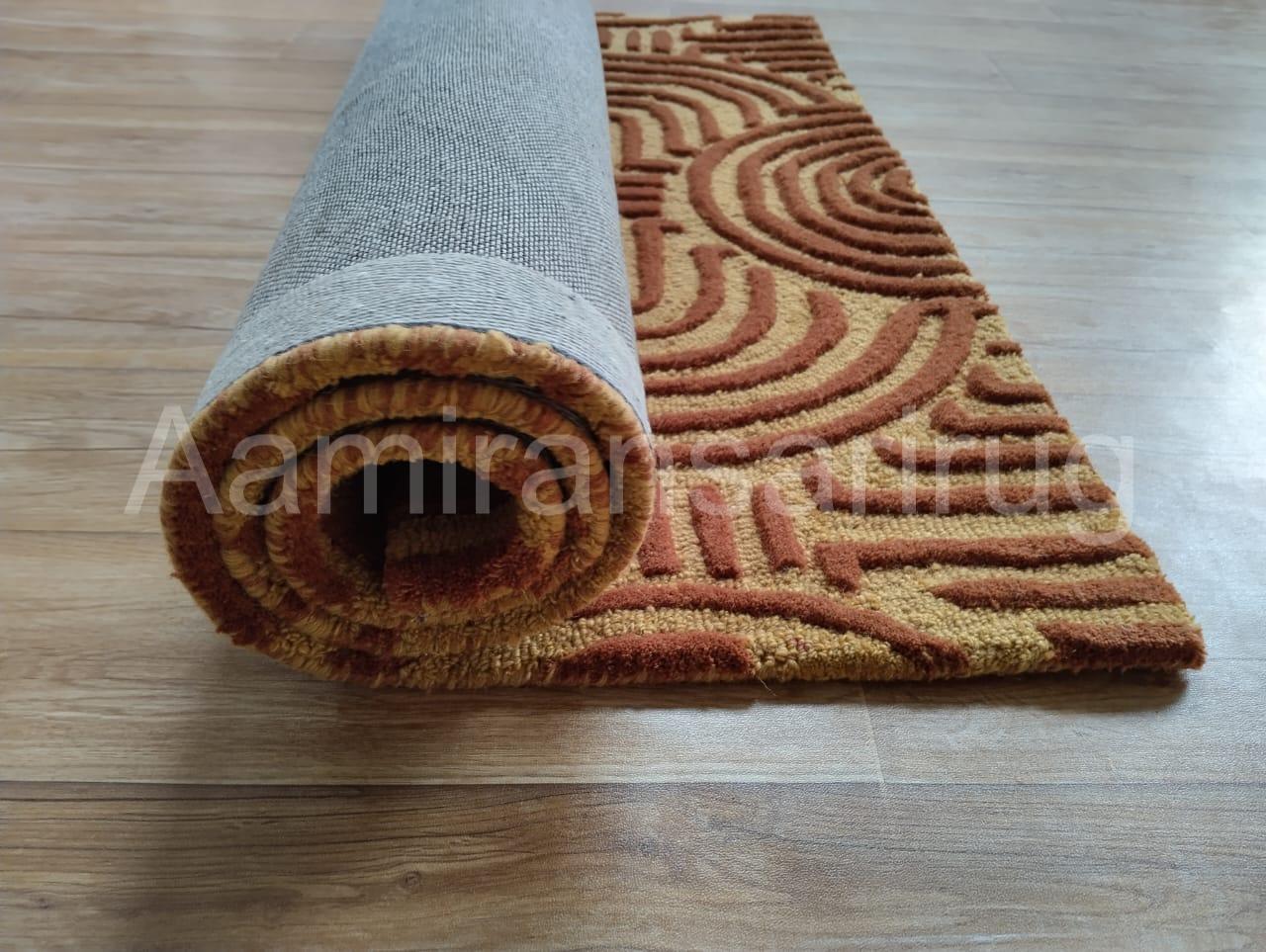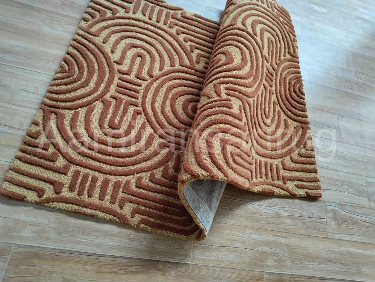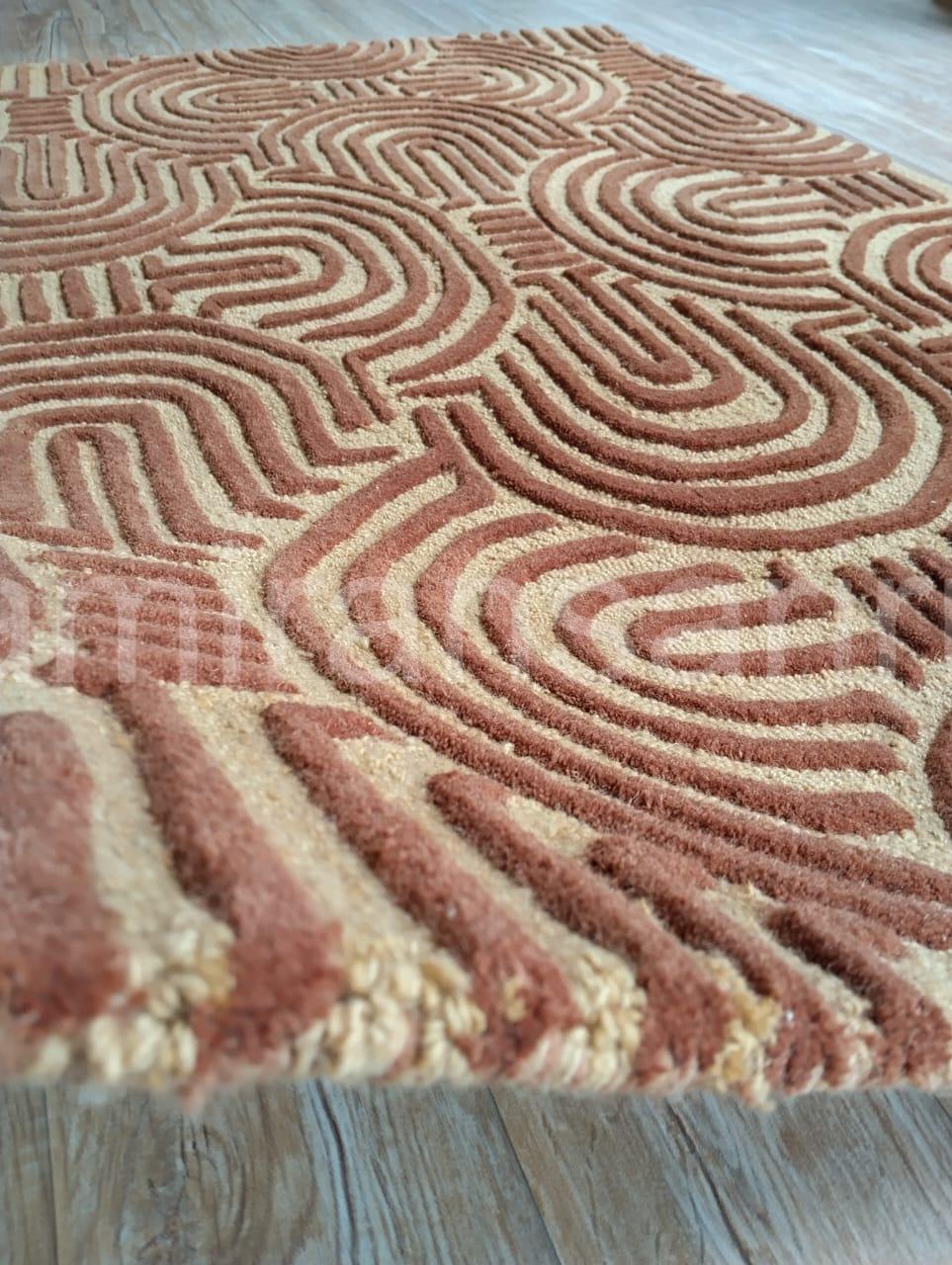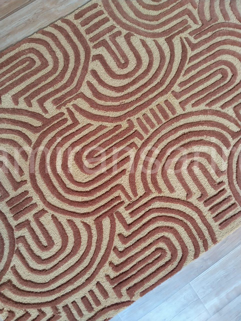 Elevate your home with this stunning hand tufted wool carpet, crafted with care to bring warmth, comfort, and timeless design to your space. This premium area rug features a bold geometric pattern in earthy tones, perfect for adding a touch of modern sophistication to any room. The unique texture highlights intricate arcs and lines, giving your interior a striking mid-century and boho-inspired aesthetic.