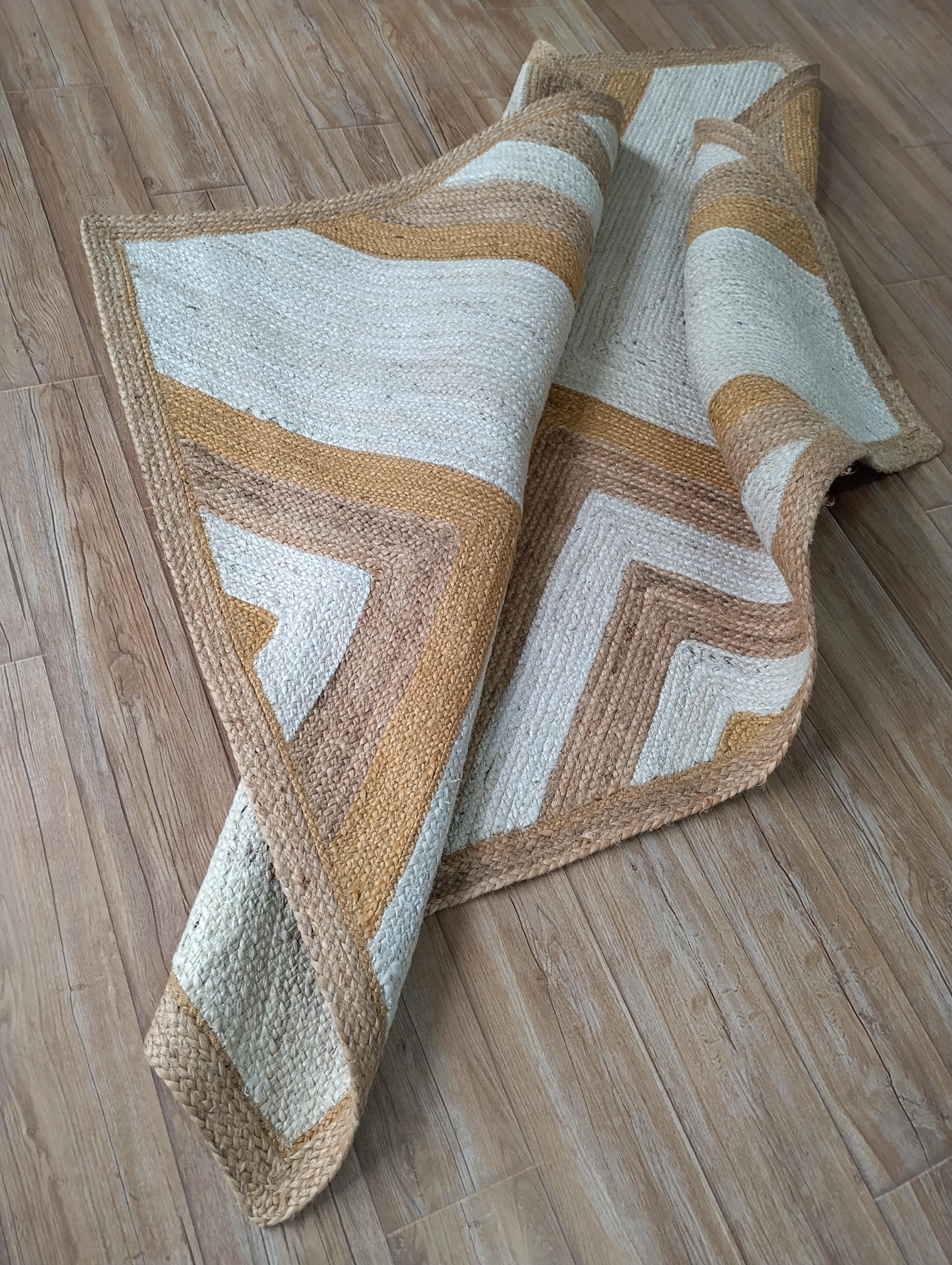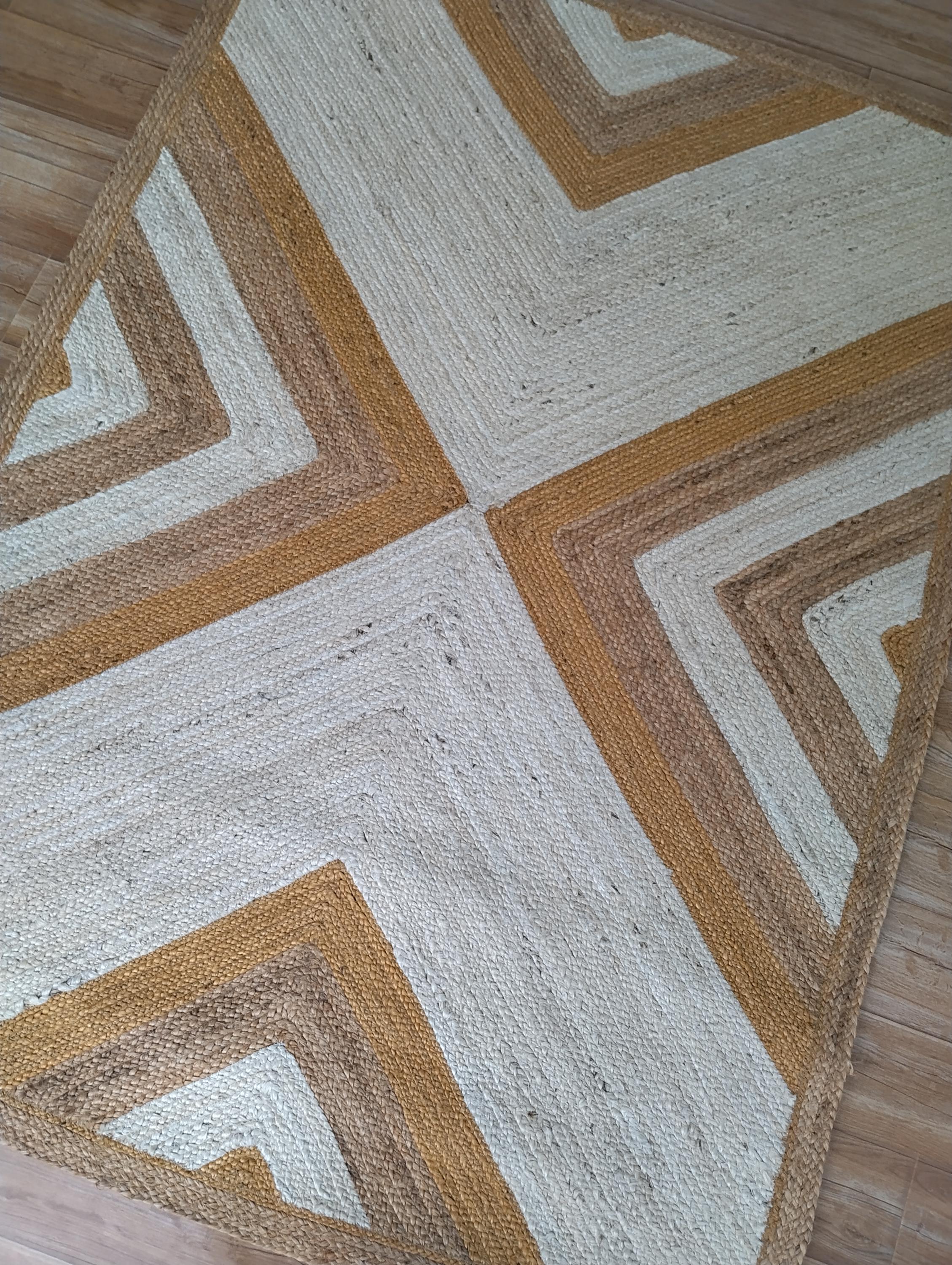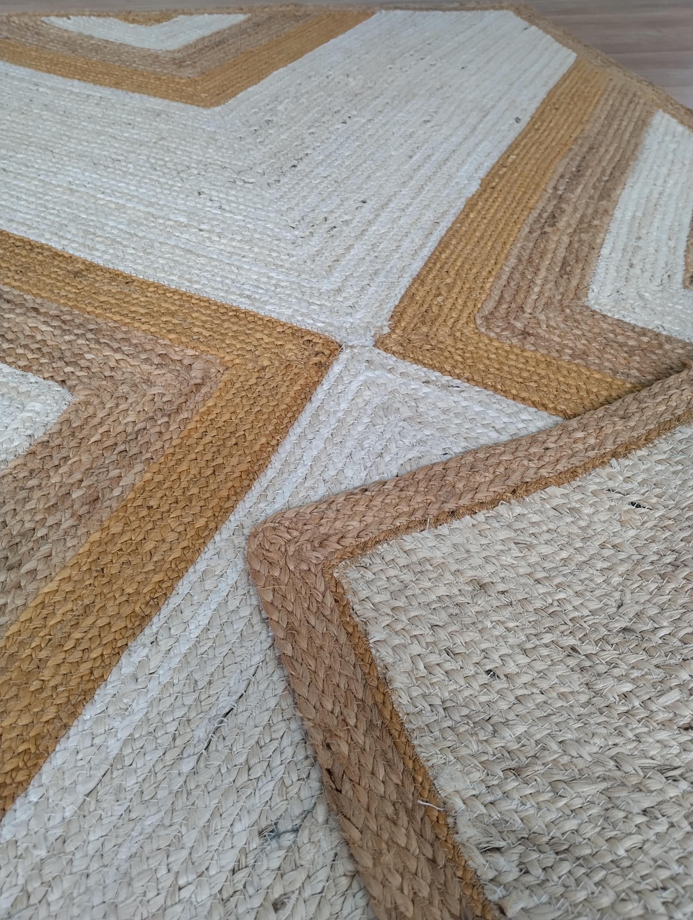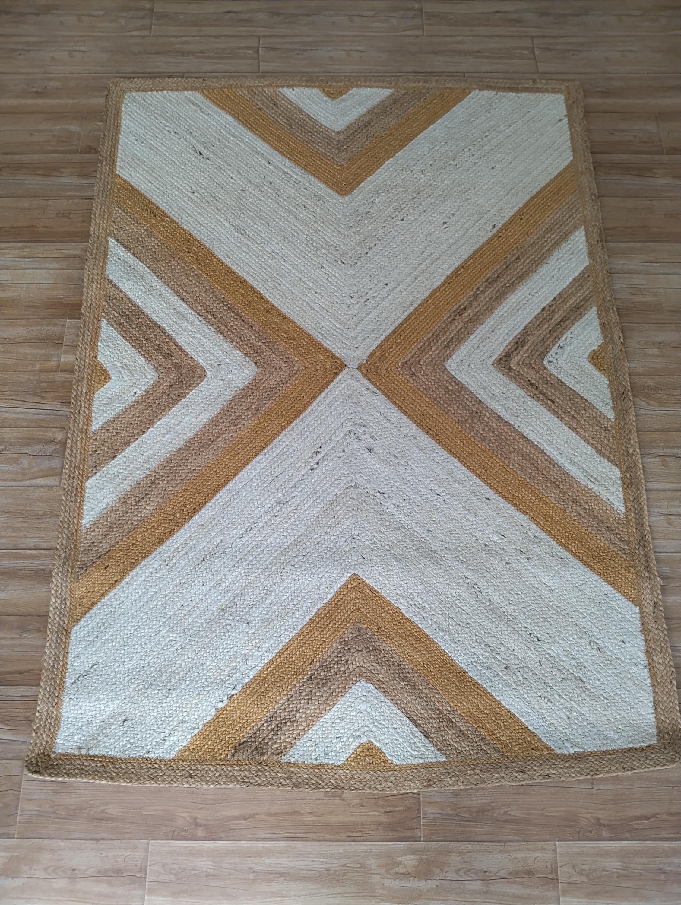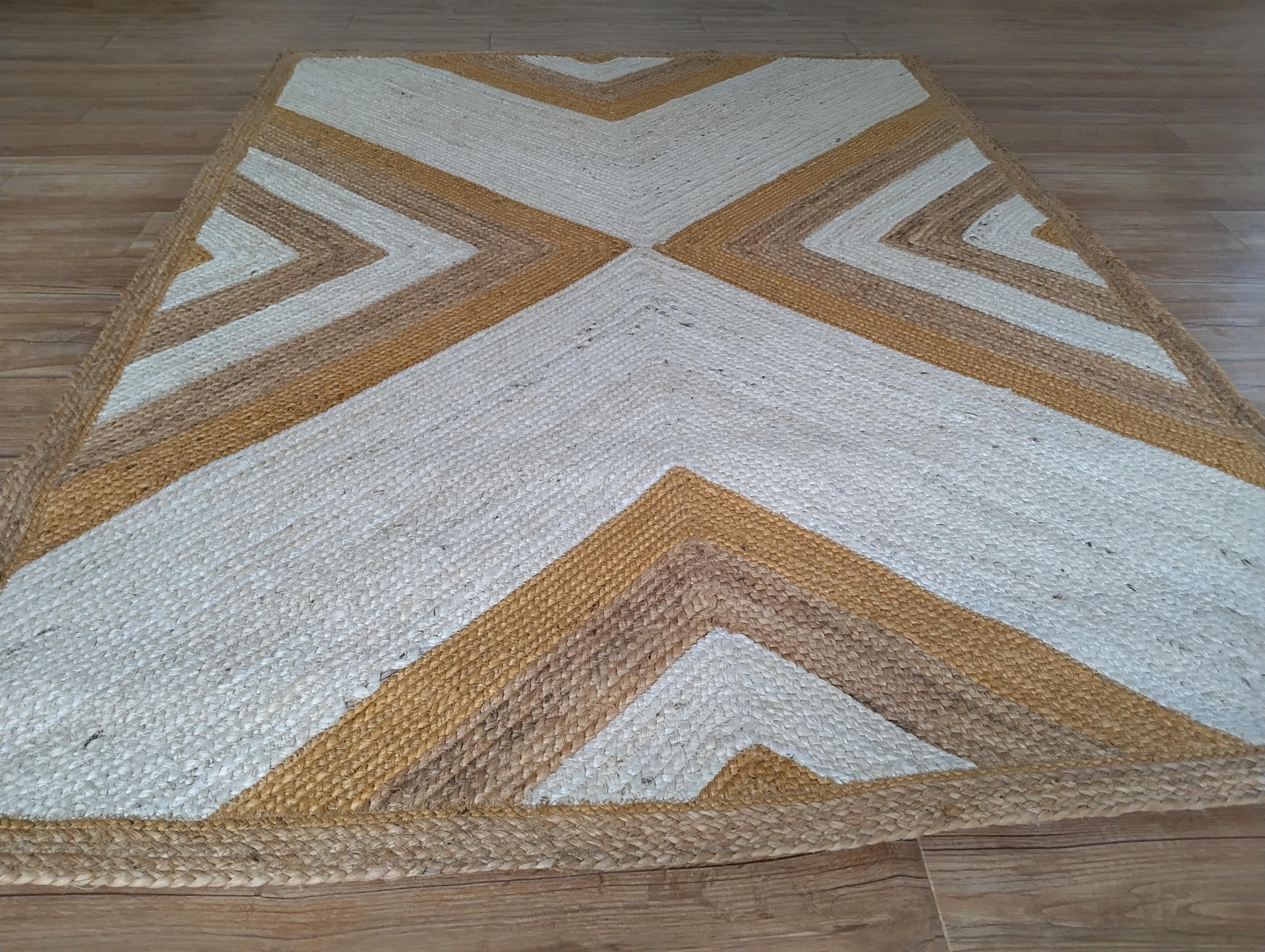 Bring warmth, texture, and timeless beauty into your home with this handwoven jute rug, crafted with care from 100% natural fibers. Designed in an eye-catching geometric chevron pattern with earthy tones of beige, brown, and mustard, this rug makes a bold yet versatile statement in any room.