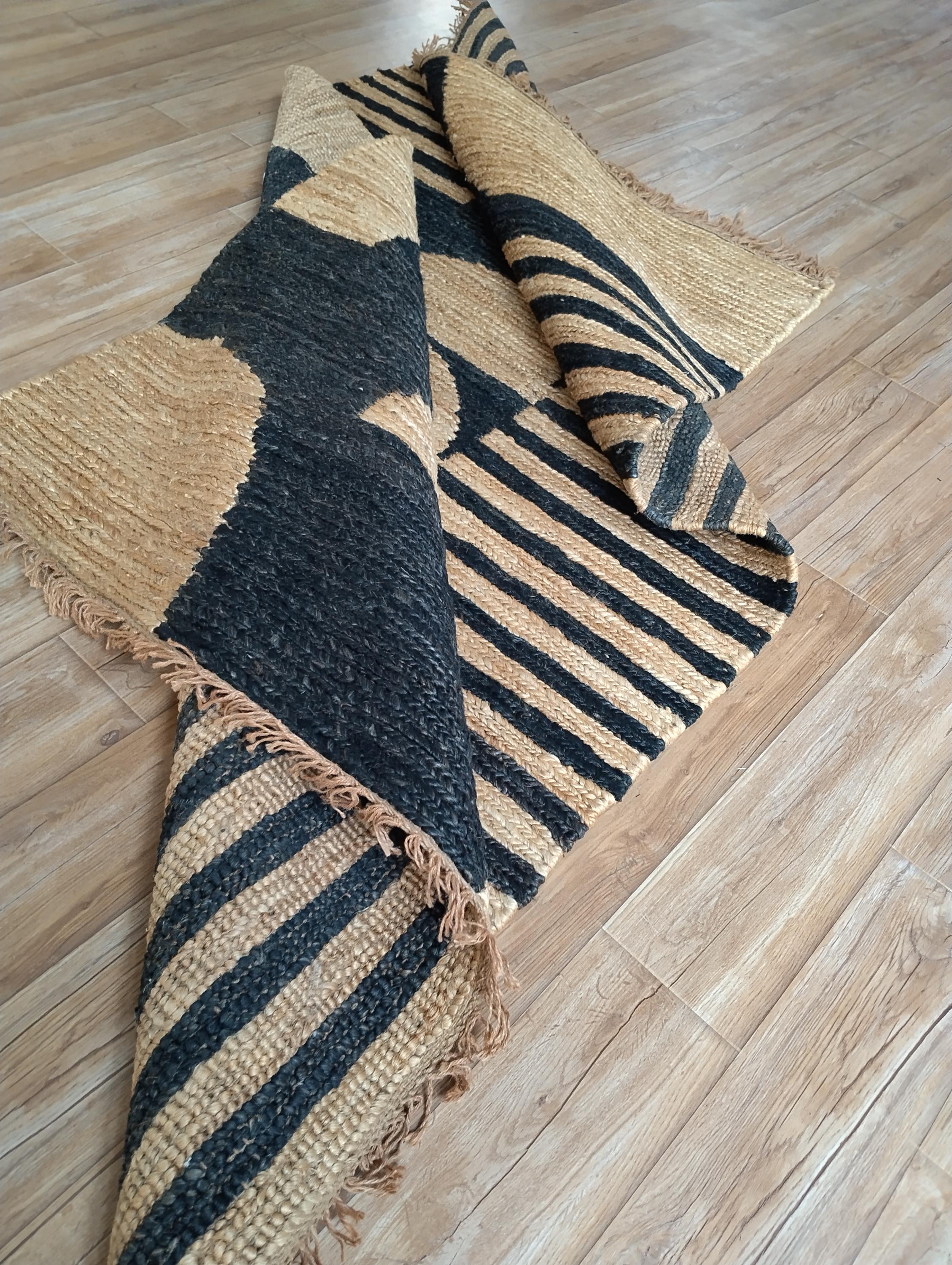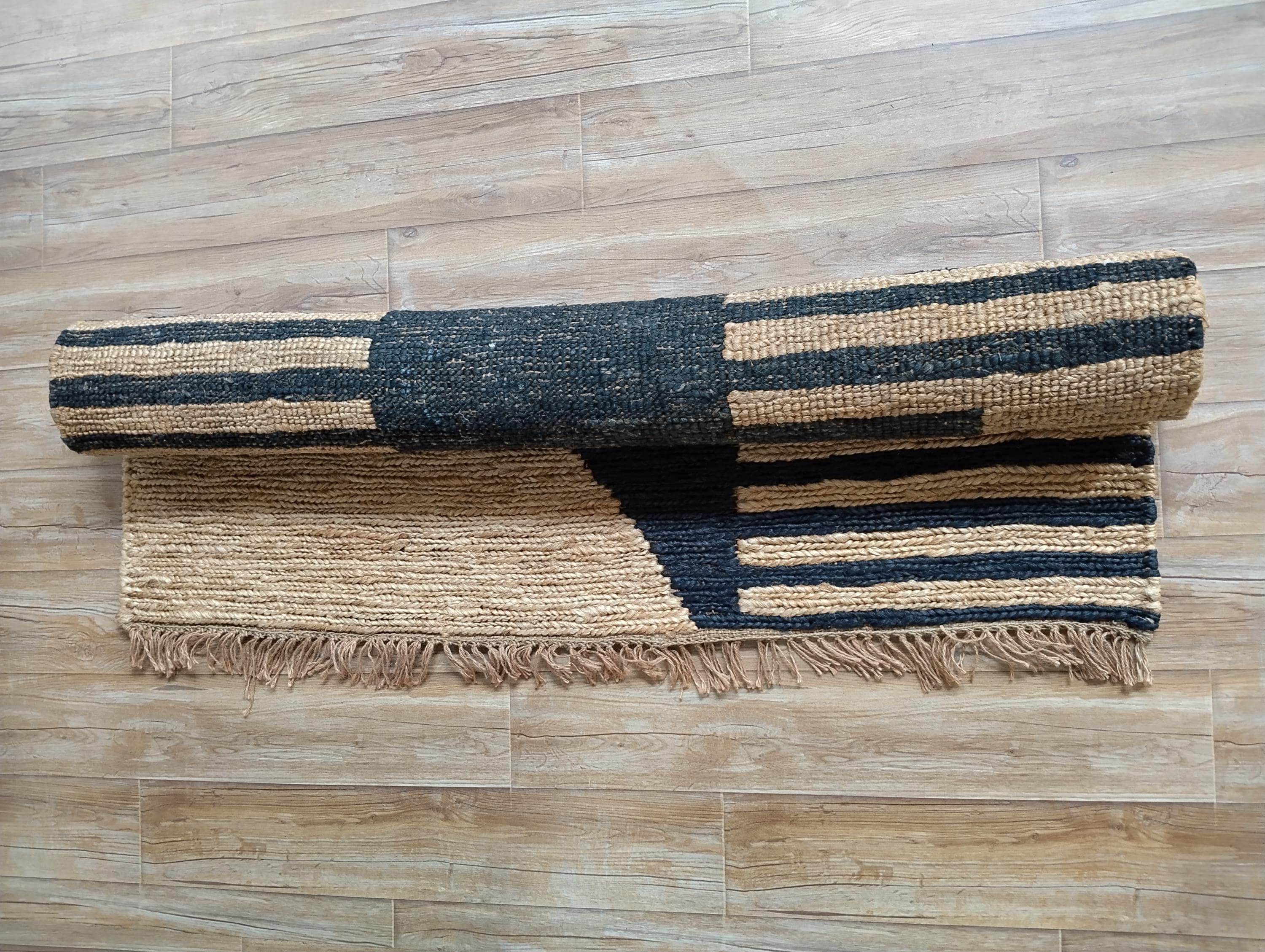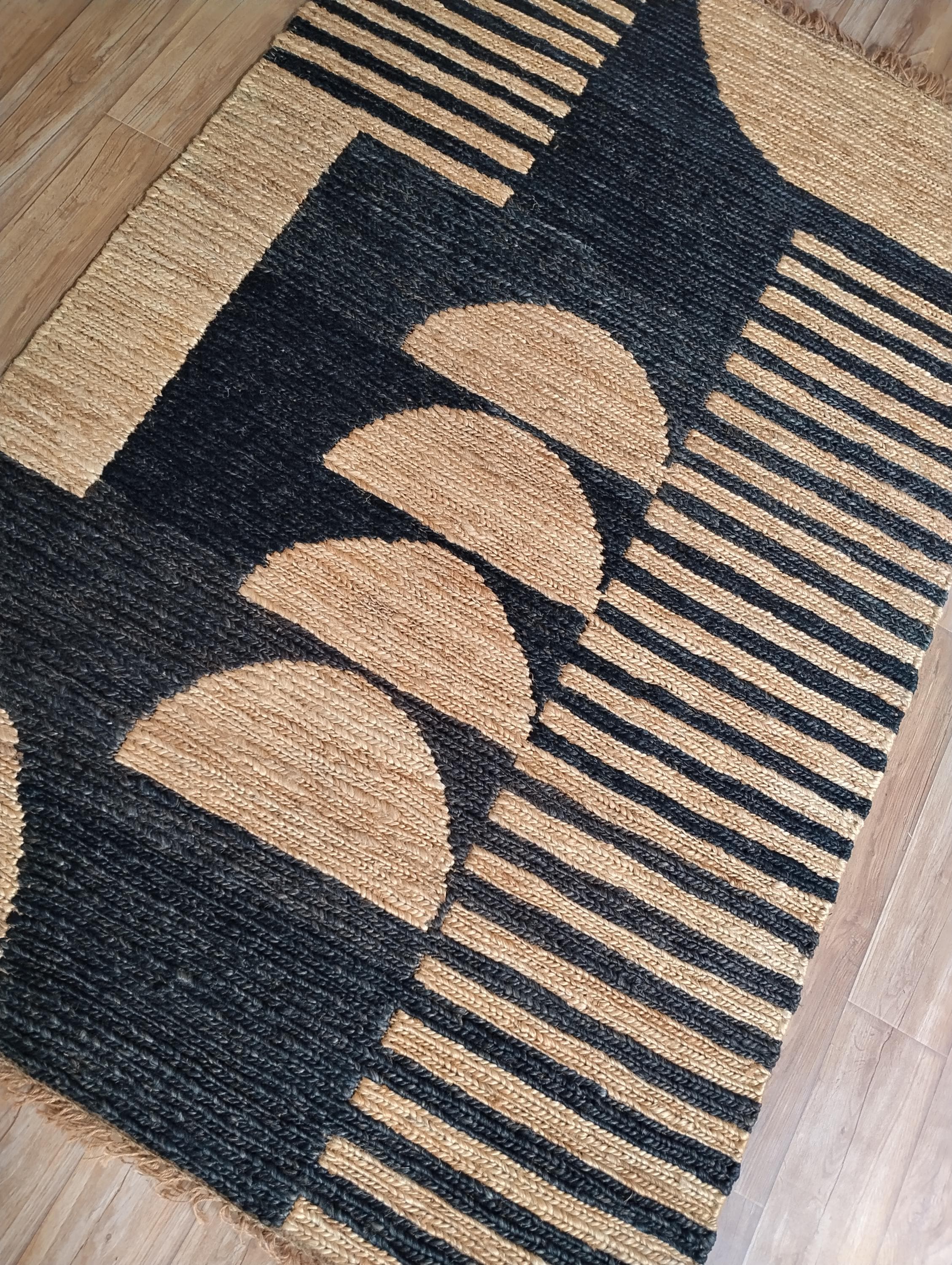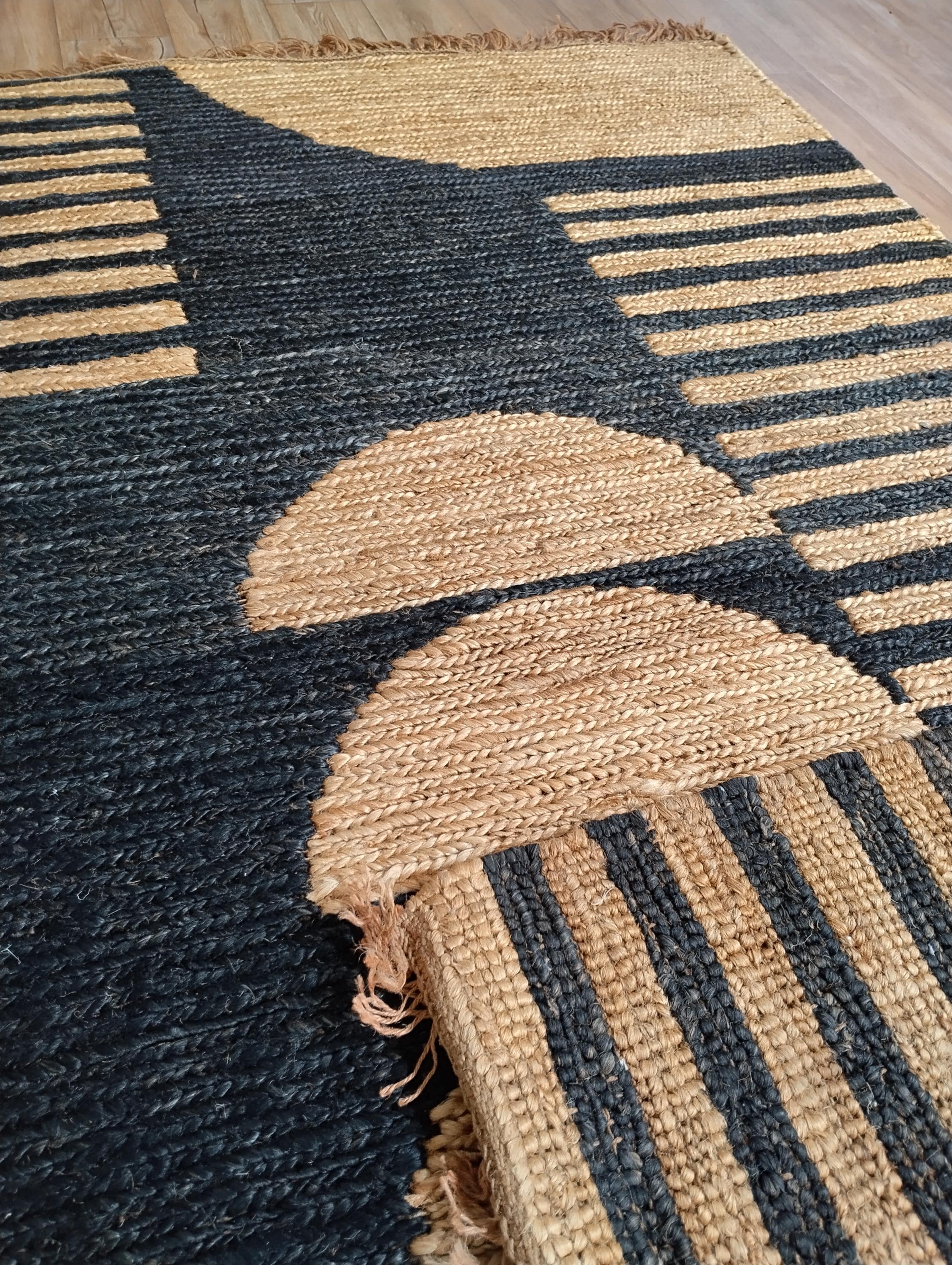 Bring warmth, texture, and timeless beauty to your home with this handwoven Sumak Jute Rug, crafted from 100% natural and sustainable jute fibers. Designed with a striking black and natural geometric pattern, this rug adds an artistic yet earthy charm to any interior. The bold combination of stripes, arches, and natural tones makes it a perfect fit for modern, bohemian, Scandinavian, farmhouse, and rustic spaces.