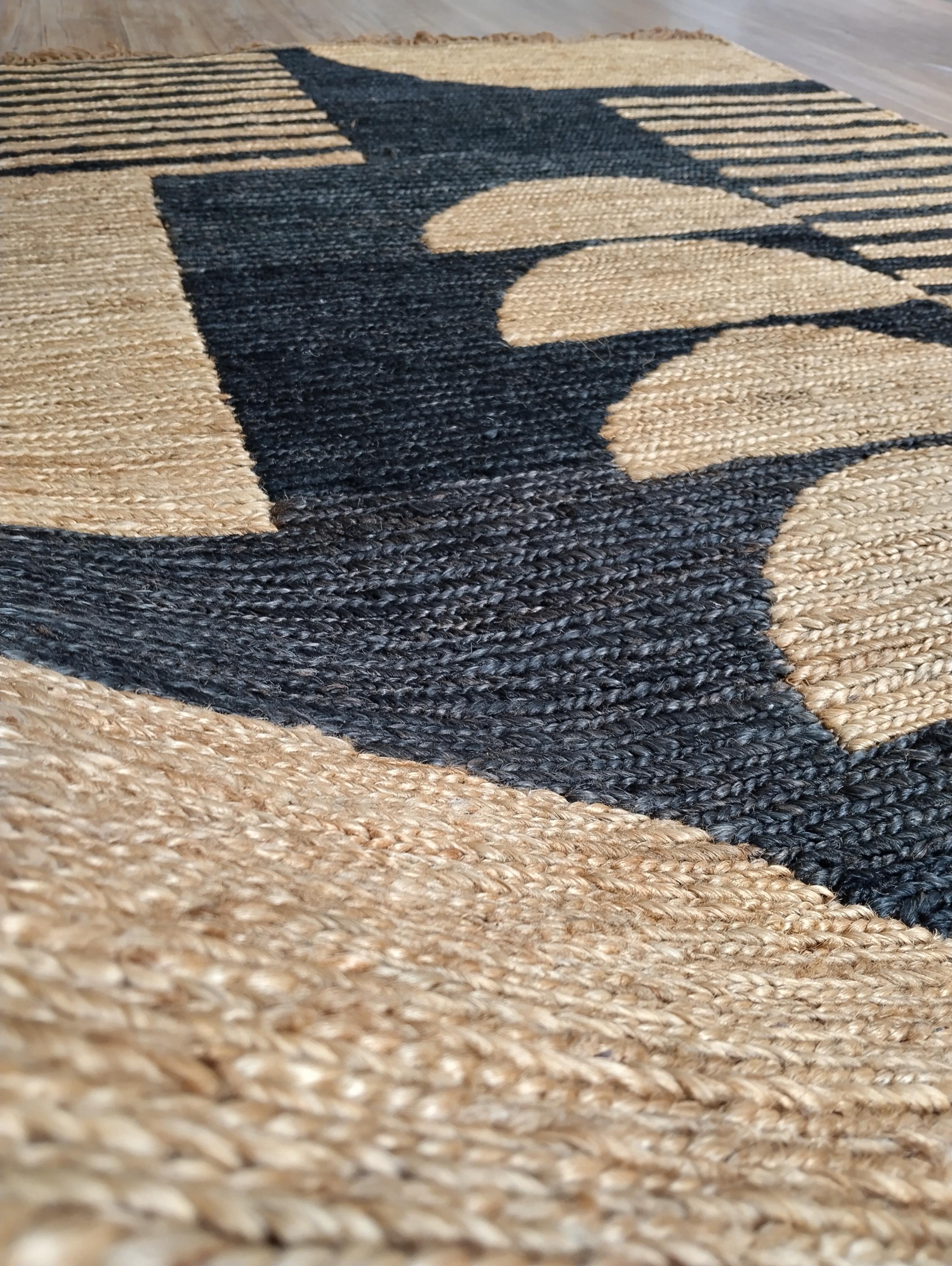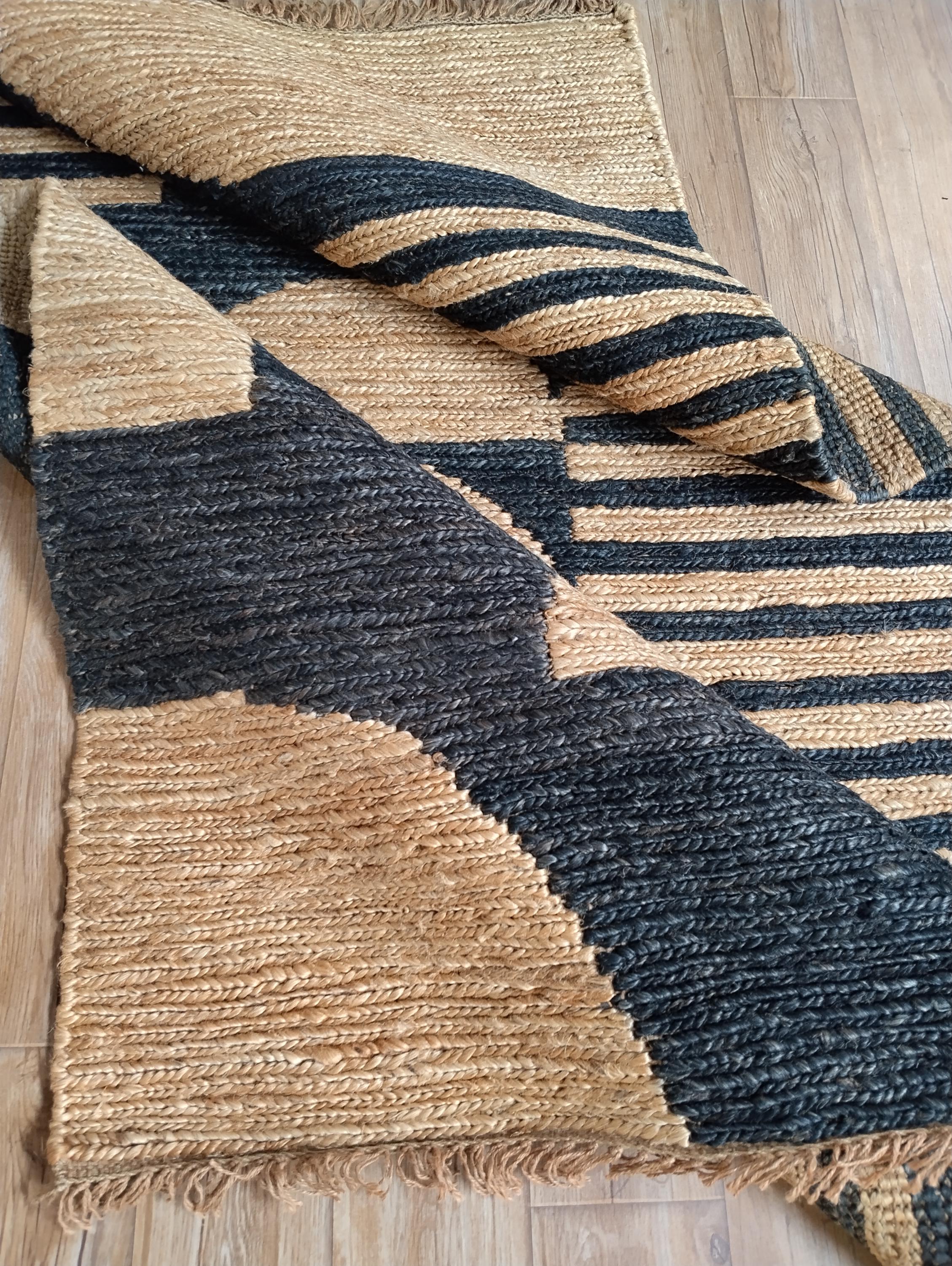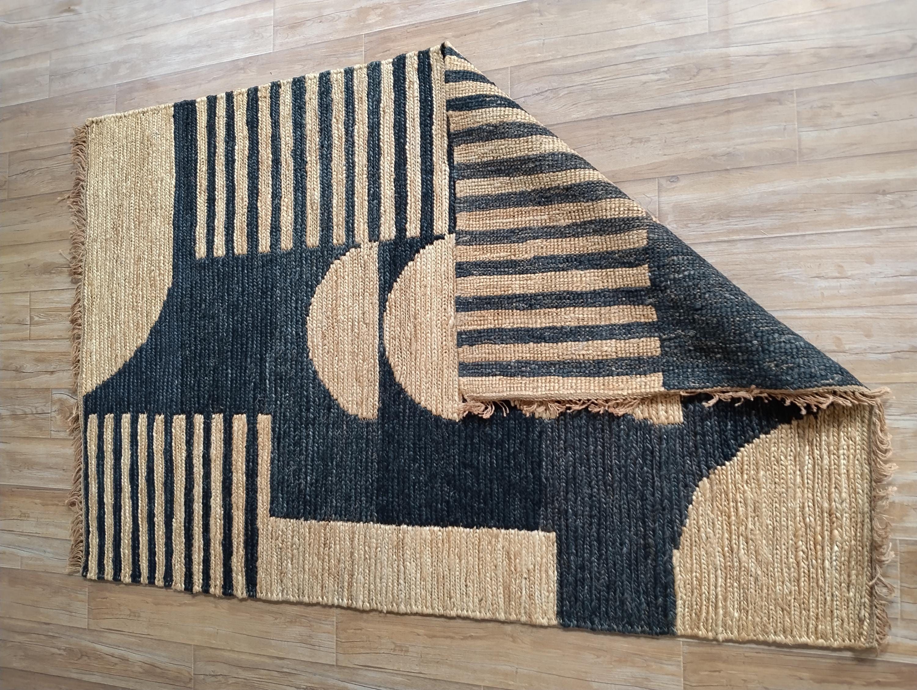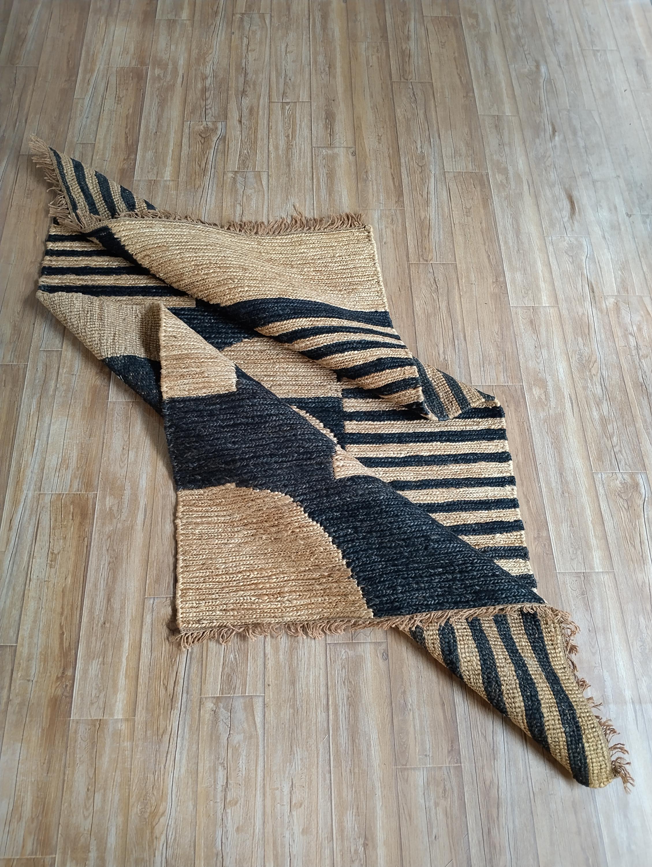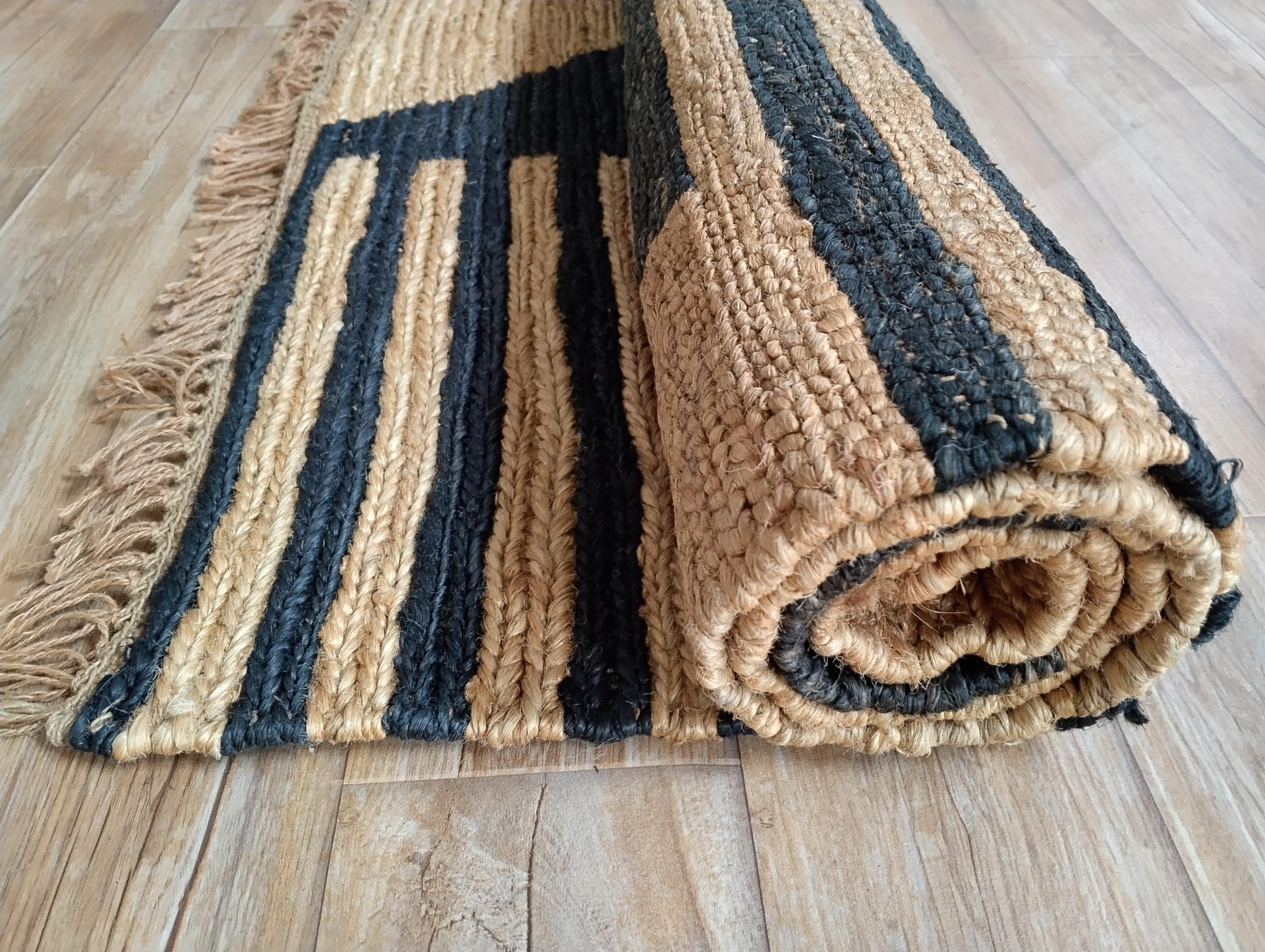 Bring warmth, texture, and timeless beauty to your home with this handwoven Sumak Jute Rug, crafted from 100% natural and sustainable jute fibers. Designed with a striking black and natural geometric pattern, this rug adds an artistic yet earthy charm to any interior. The bold combination of stripes, arches, and natural tones makes it a perfect fit for modern, bohemian, Scandinavian, farmhouse, and rustic spaces.