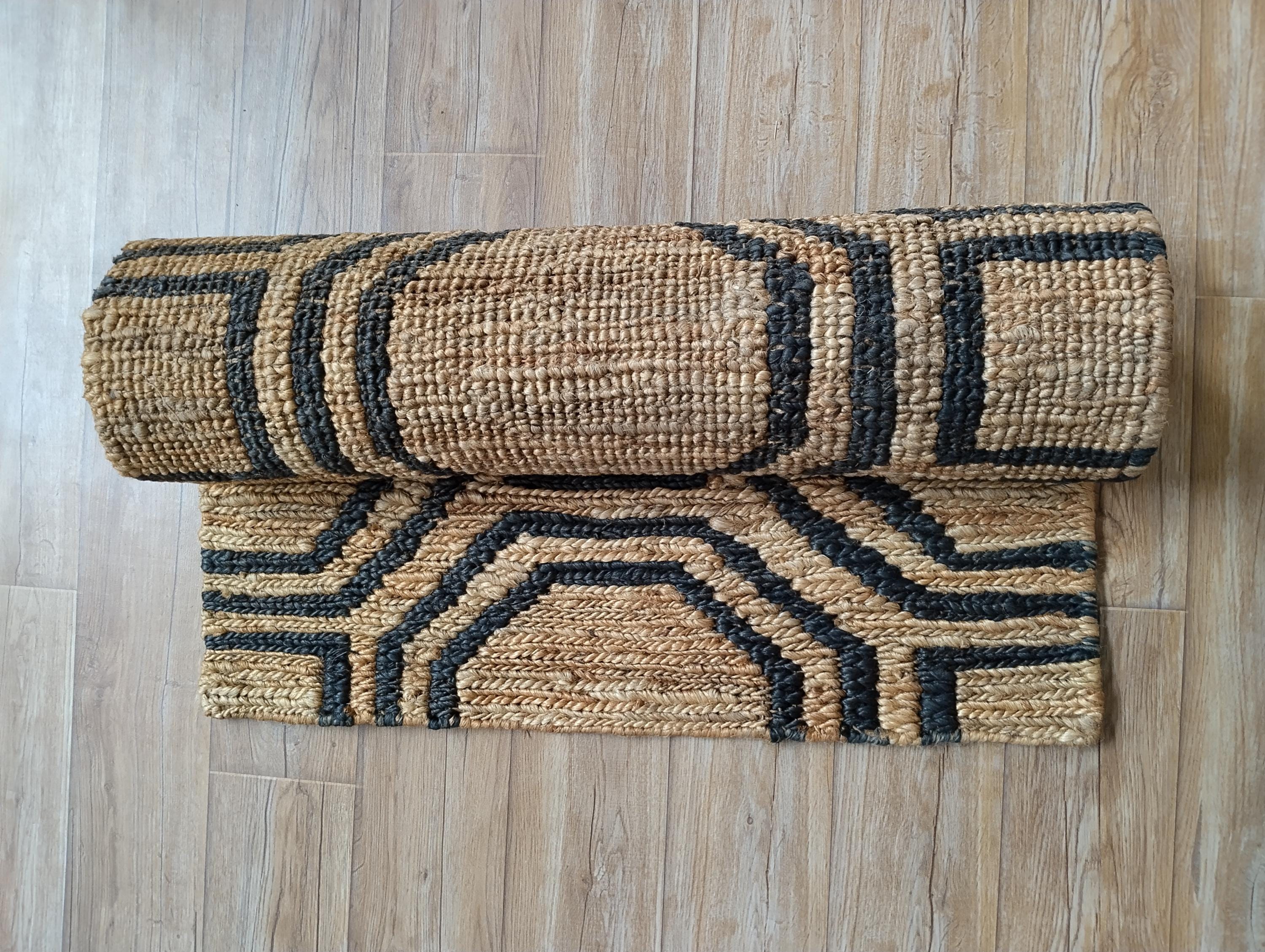 Bring warmth, texture, and timeless beauty to your home with this handwoven Sumak Jute Rug, crafted from 100% natural and sustainable jute fibers. Designed with a striking black and natural geometric pattern, this rug adds an artistic yet earthy charm to any interior. The bold combination of stripes, arches, and natural tones makes it a perfect fit for modern, bohemian, Scandinavian, farmhouse, and rustic spaces.