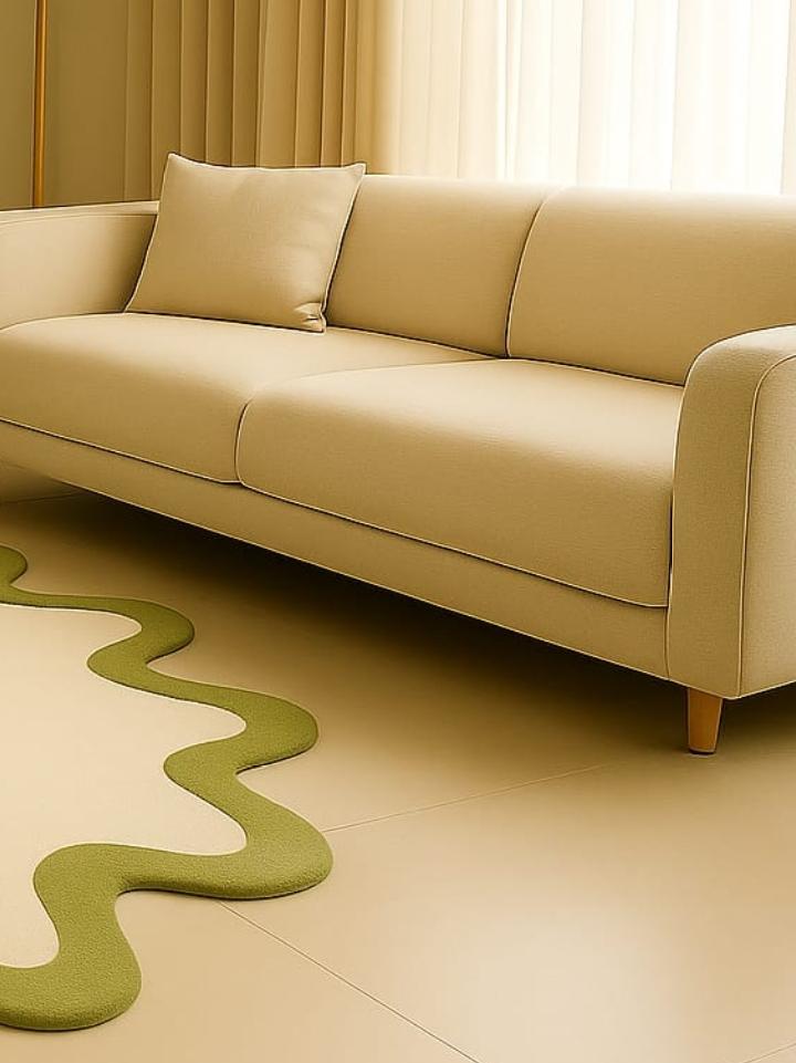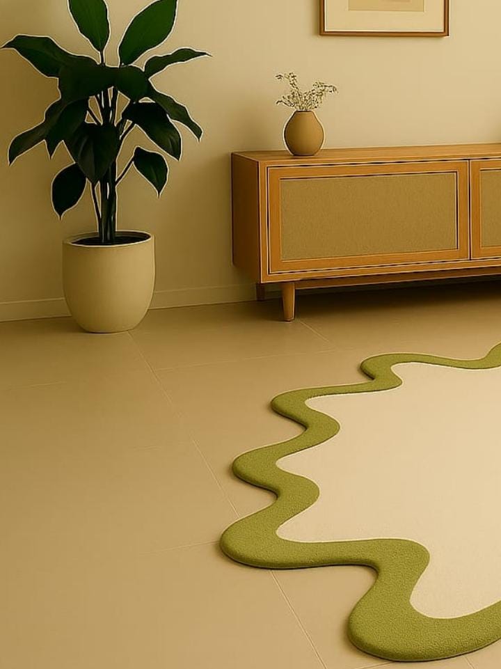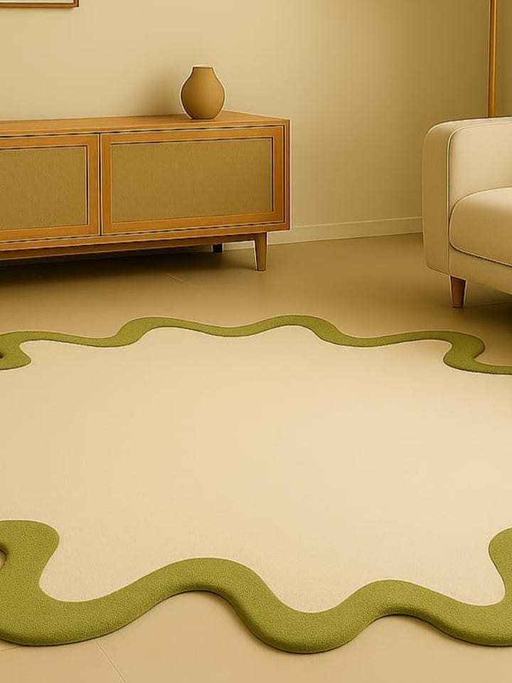 Bring playful charm and modern elegance into your space with our Wavy Edge Abstract Rug – a unique piece designed to add warmth, personality, and creativity to any room. This irregular blob-shaped carpet blends soft beige tones with a bold green border, making it the perfect accent for living rooms, bedrooms, nurseries, or play areas.