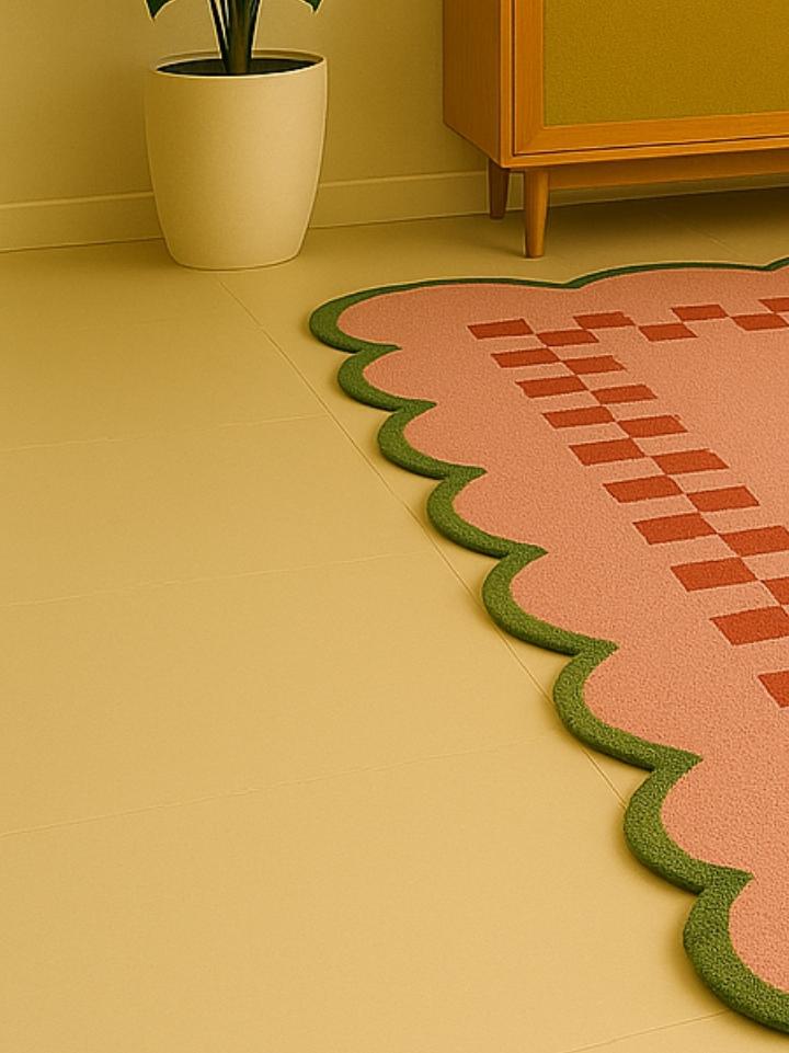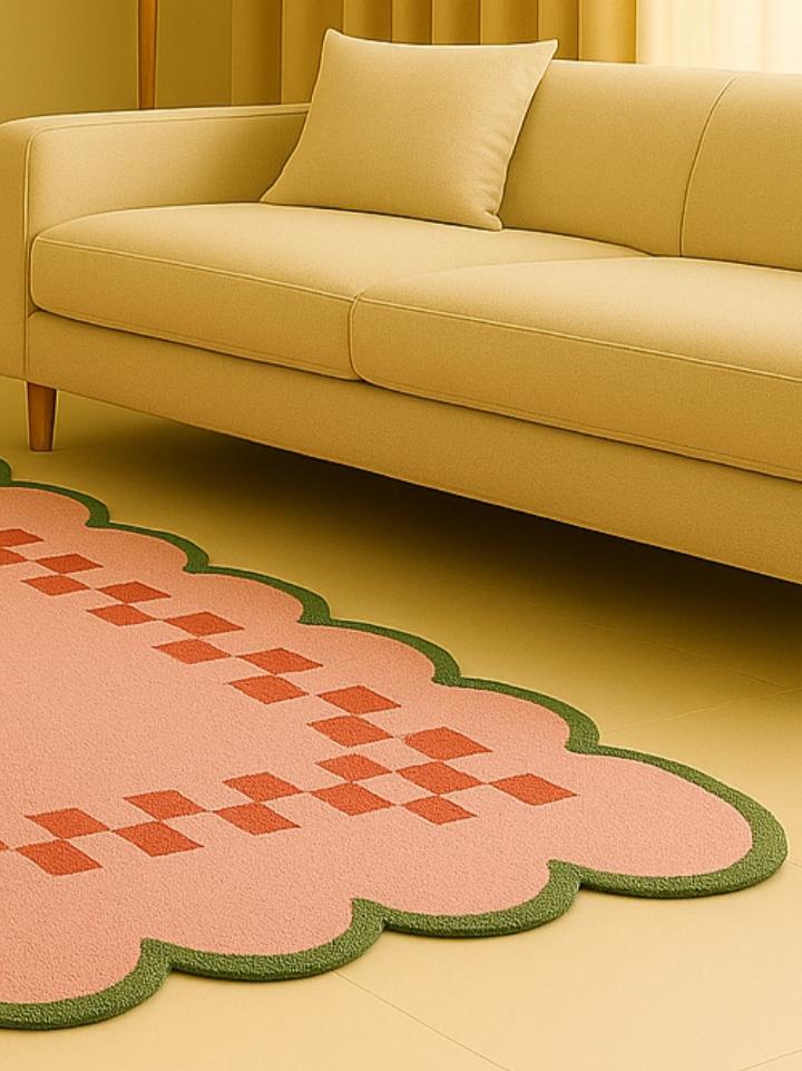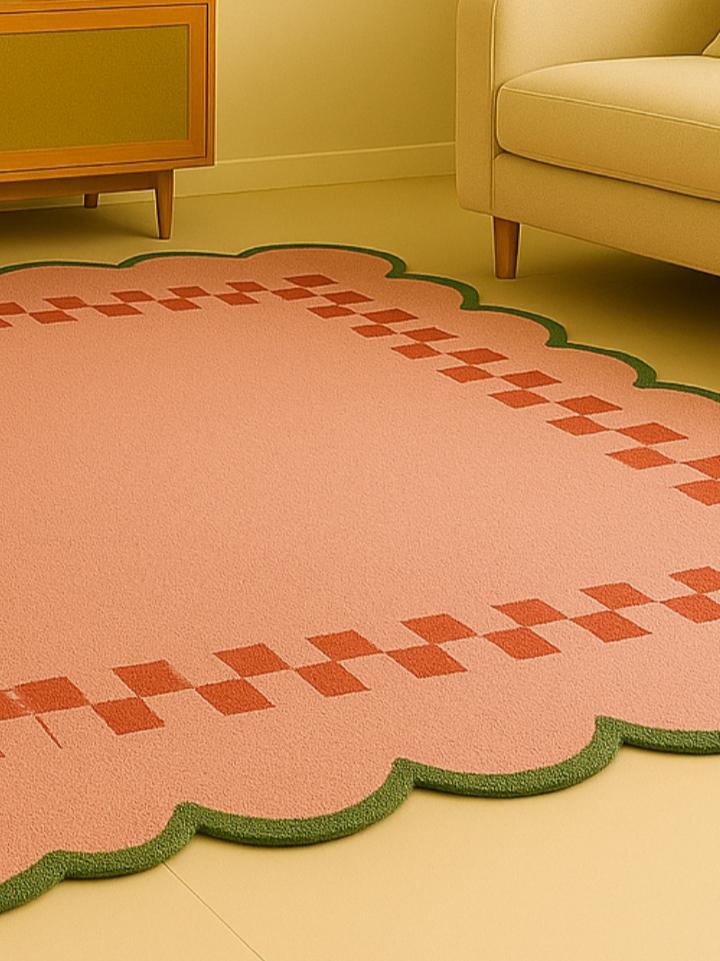 Transform your living space with this modern pink scalloped rug featuring a charming checkerboard border and soft pastel tones. Designed with a playful wavy edge and green trim, this rug perfectly blends retro mid-century modern style with contemporary minimalist design. Its unique shape and aesthetic color combination make it a standout piece for any living room, bedroom, or cozy apartment.