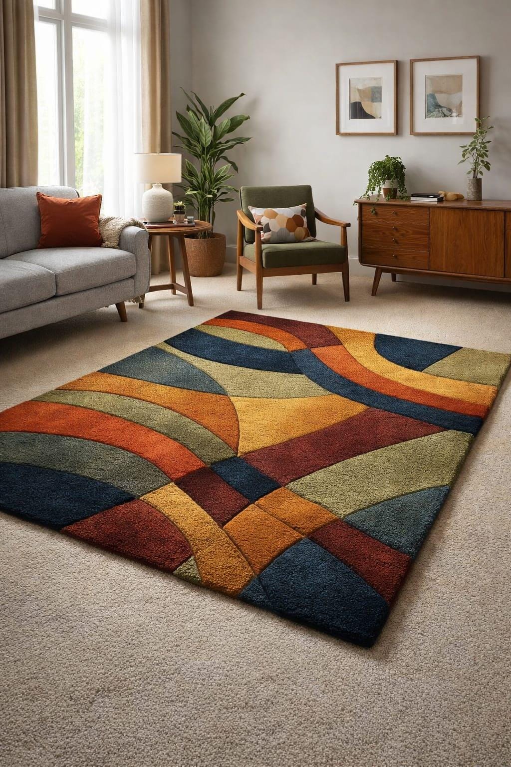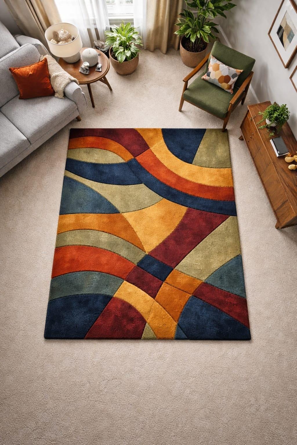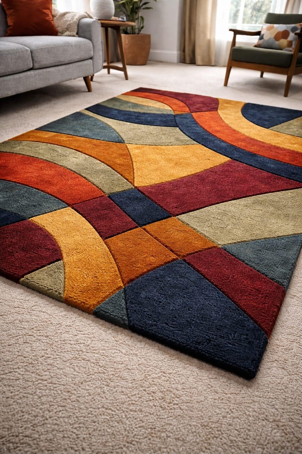 The artistic geometric pattern blends mustard yellow, rust, navy blue, olive green, and earthy tones, creating a visually striking yet balanced look. Ideal for living rooms, bedrooms, offices, or creative spaces.