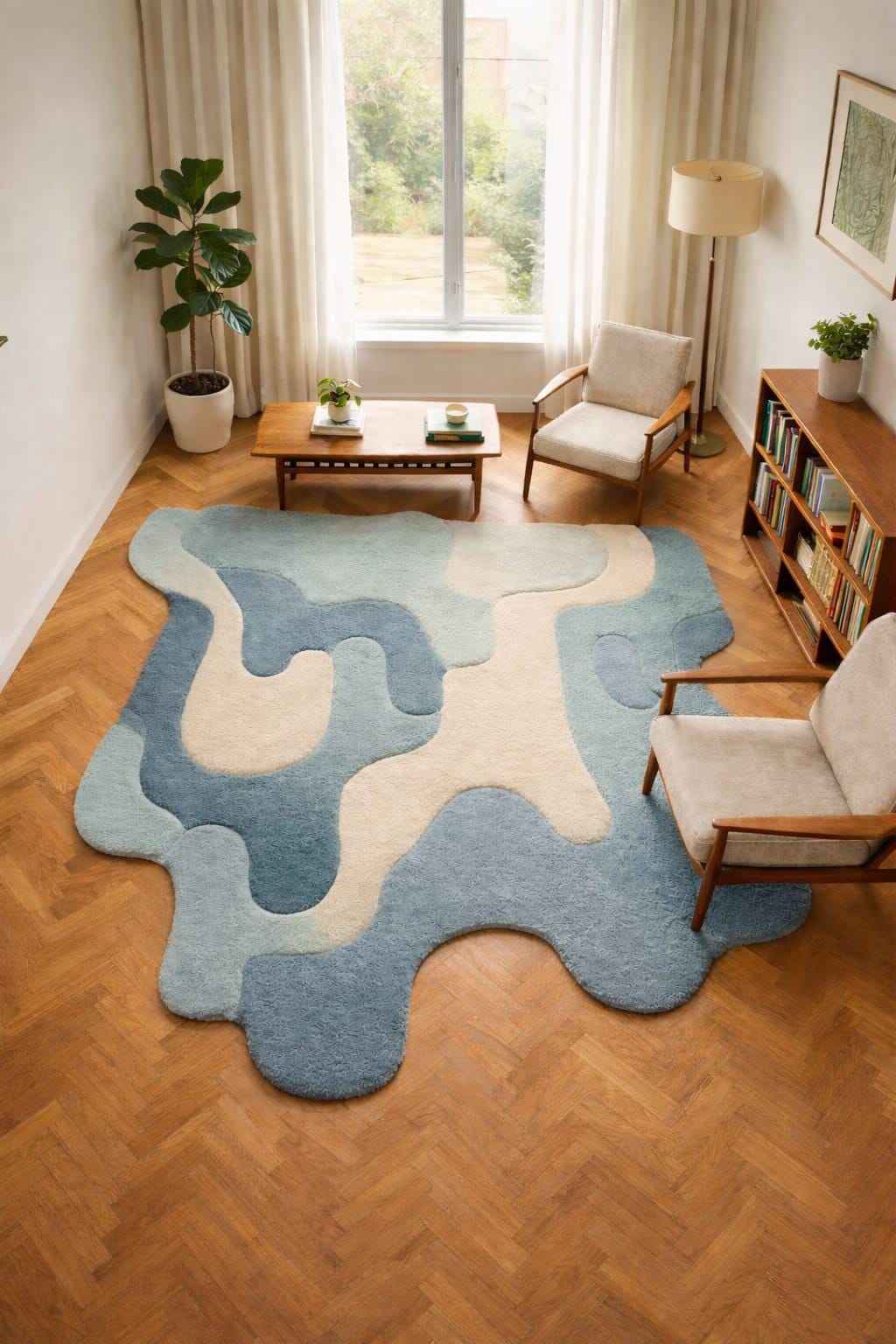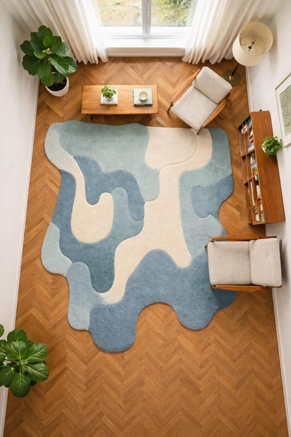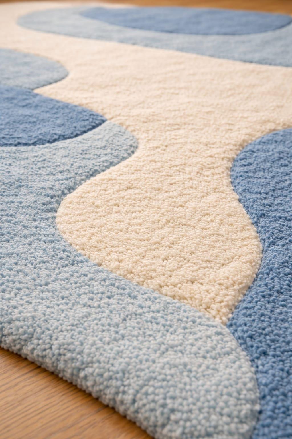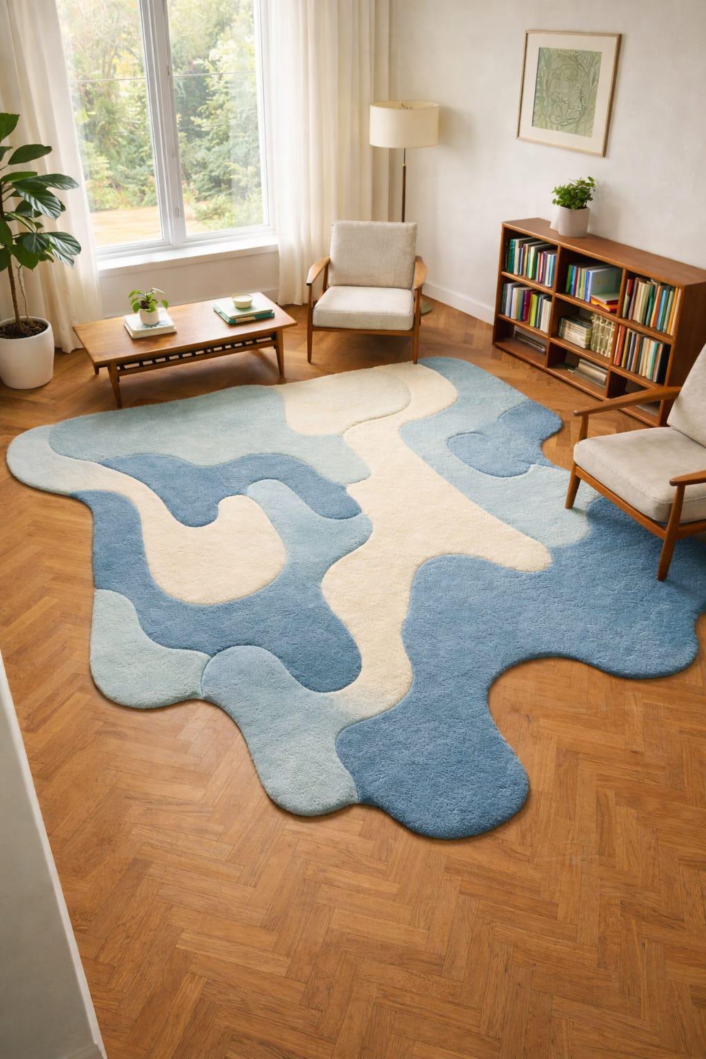 Bring modern art to your floor with this stunning hand tufted abstract shaped rug, designed to elevate any contemporary interior. Inspired by organic forms and soft flowing patterns, this rug features calming blue and cream tones that blend beautifully with modern, Nordic, and minimalist home décor styles.