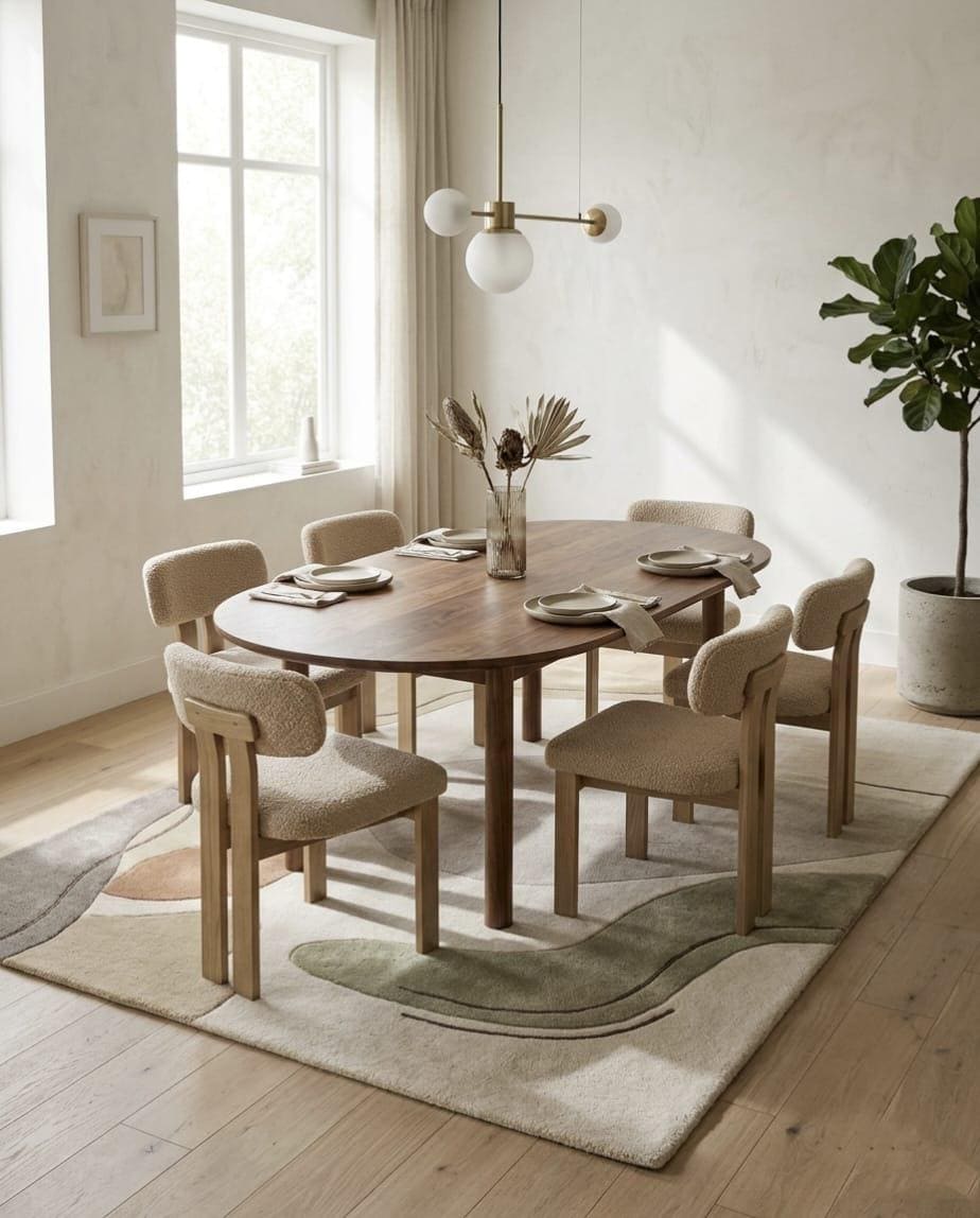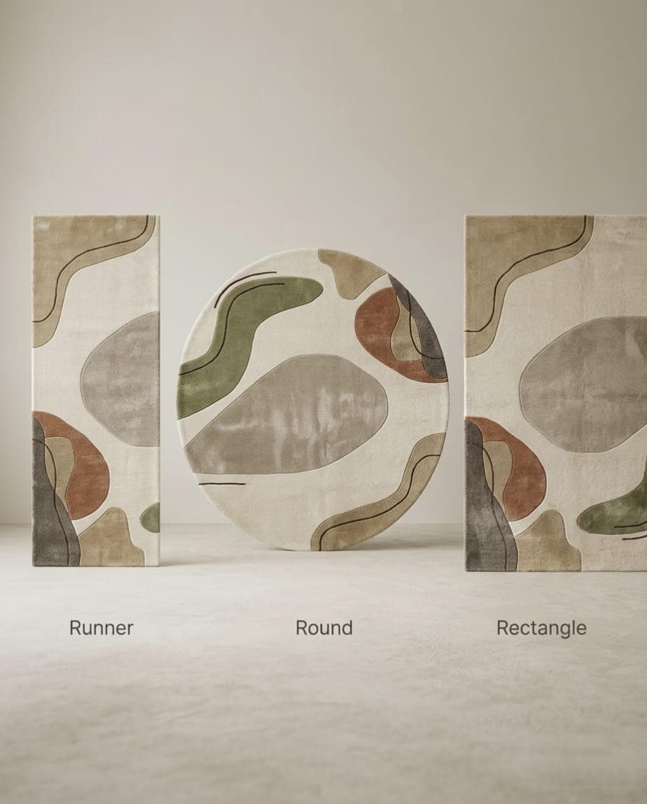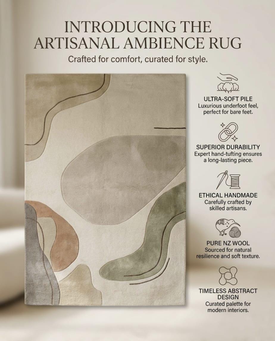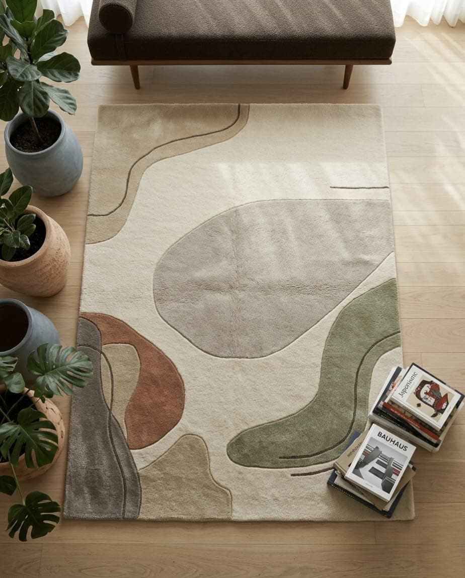 Bring warmth and modern elegance to your space with this beautifully handcrafted wool rug. Designed with soft organic shapes and a calming neutral palette of beige, green, and earthy tones, this rug perfectly complements contemporary, minimalist, and Scandinavian interiors.