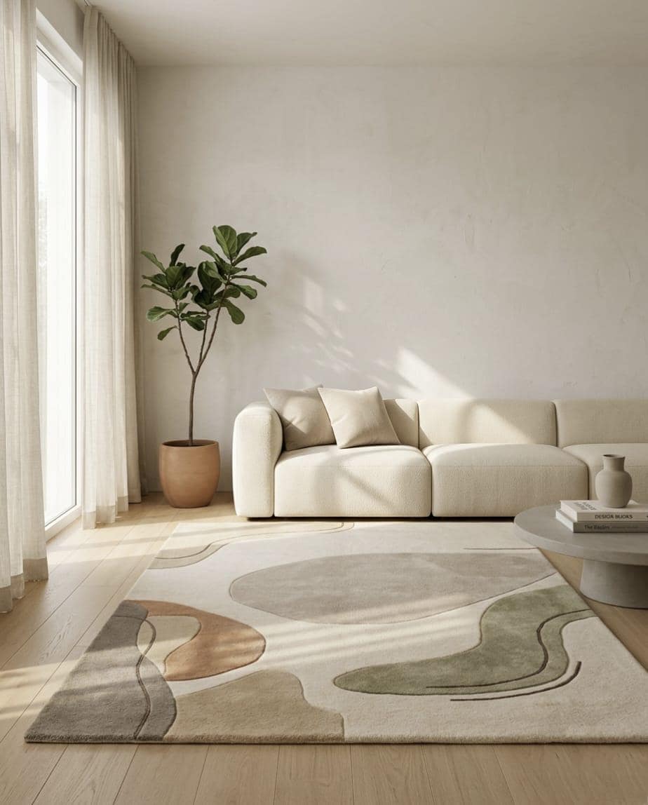 Modern Abstract Wool Rug Hand Tufted Area Rug Neutral Beige Green Carpet Minimalist Living Room Rug Contemporary Organic Shape Floor Rug